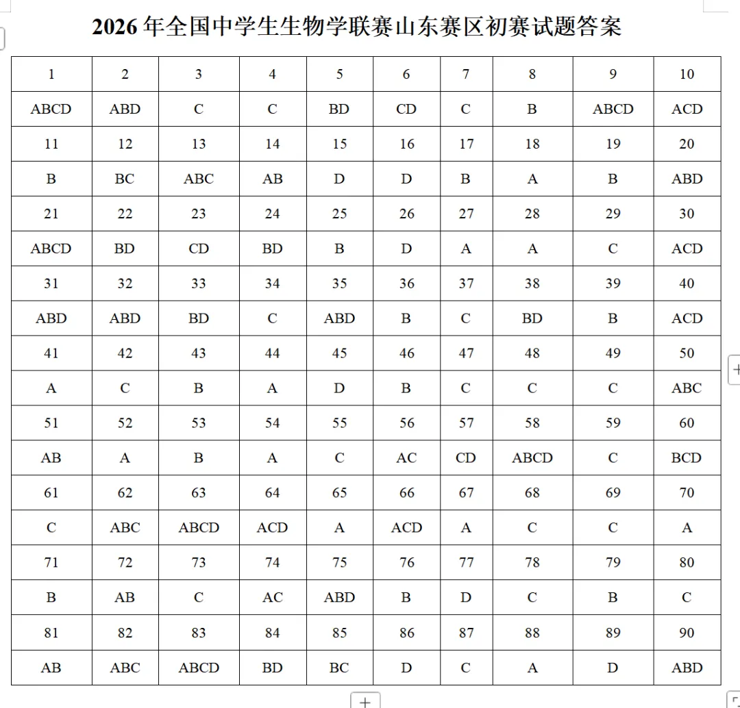 2026年全国中学生生物学联赛山东赛区初赛试题答案