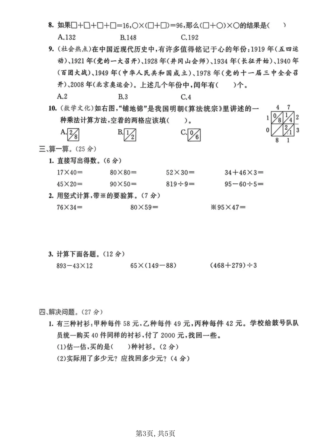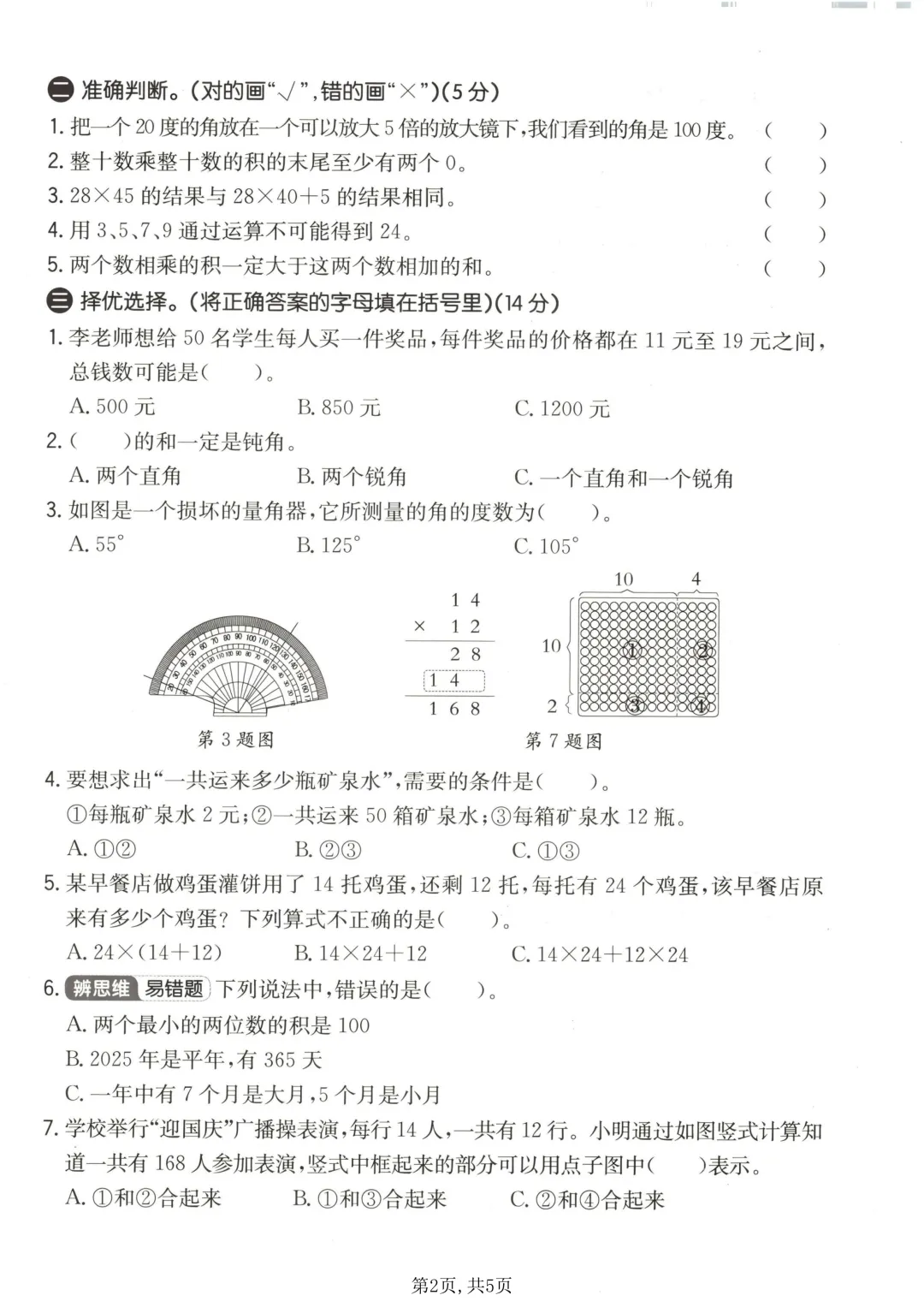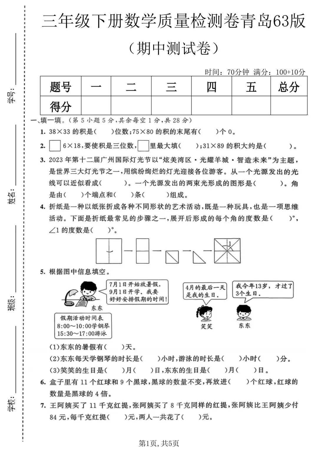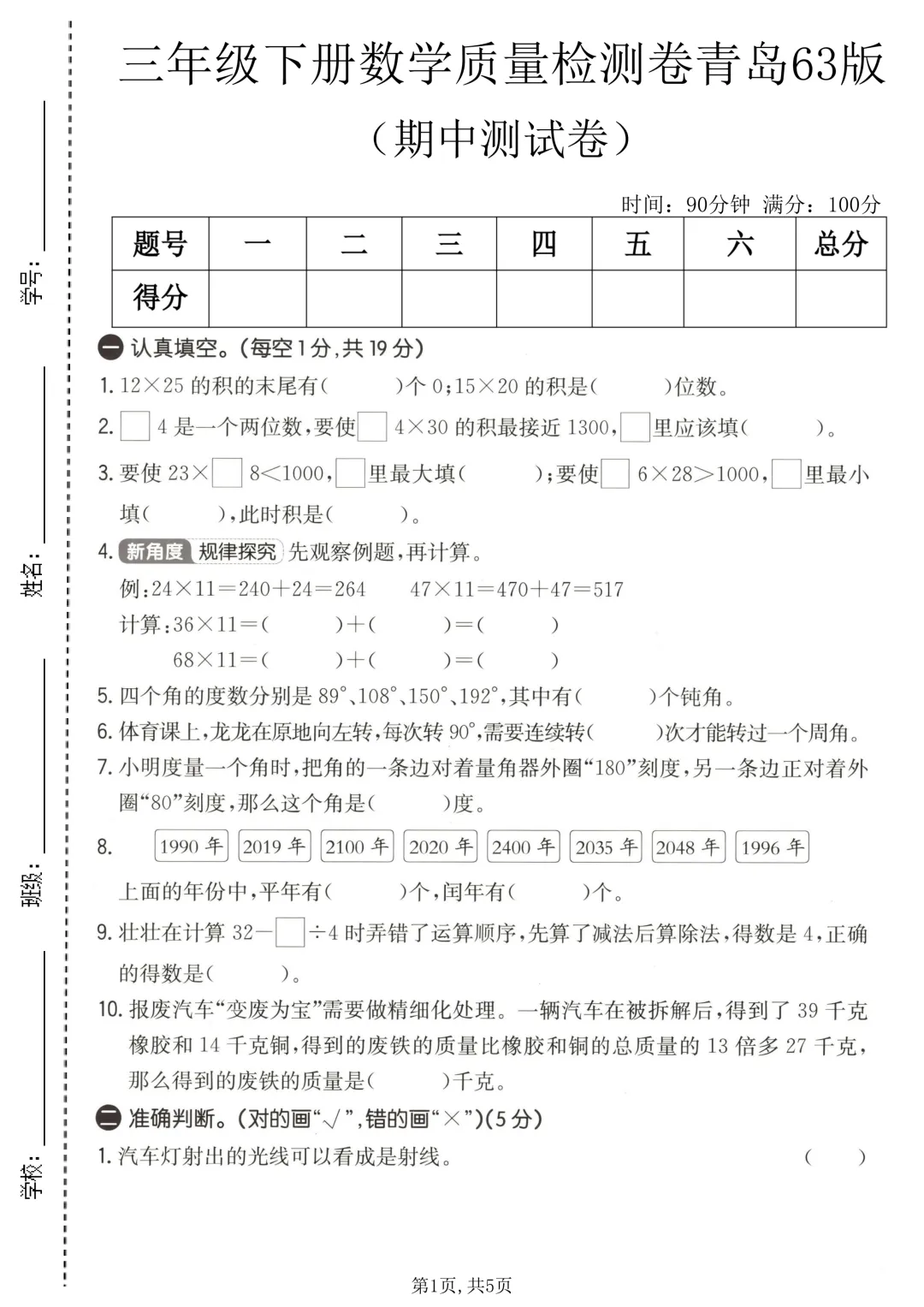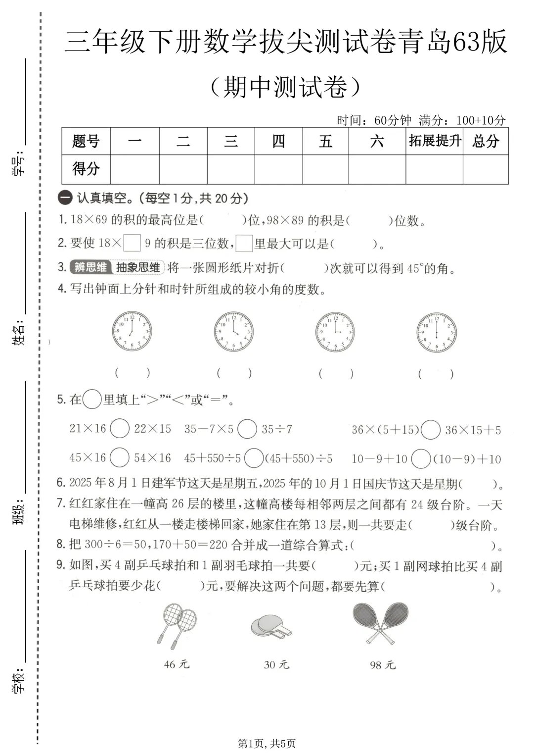 26年春三年级(下)数学 期中拔尖测试卷《青岛63版》。贴合教材与考情:试卷严格同步青岛 63 制教材进度,深度贴合本地校内统考命题趋势,覆盖两位数乘两位数、除数是一位数的除法、长方形和正方形的面积、年・月・日、小数的初步认识、分数的初步认识、千米和吨、解决问题的策略等全册核心重难点,针对性强,避免无效刷题。分层设计,适配不同基础:试卷采用 “基础过关 + 拔尖提升” 双轨分层设计,基础卷聚焦口算、竖式计算、单位换算等必拿分题型,帮孩子筑牢计算、几何、单位换算等核心根基;提升卷侧重知识灵活运用、易错点强化、解题技巧训练,适合想要巩固拔高、冲刺满分、突破学习瓶颈的孩子。需要的家长抓紧打印出来,让孩子写一写,练一练吧。