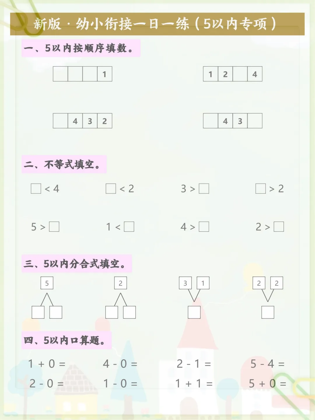 新版·幼小衔接一日一练(5以内专项)一,共5页,电子版可下载可打印,这份幼小衔接专项练习围绕5以内相关内容进行训练,帮助孩子在入学前熟悉基础知识、巩固关键能力,循序渐进提升学习自信与专注力。内容贴合幼小衔接阶段的学习需求,适合家长在家配合孩子进行日常练习,需要的家长可以抓紧下载打印出来,让孩子练一练。