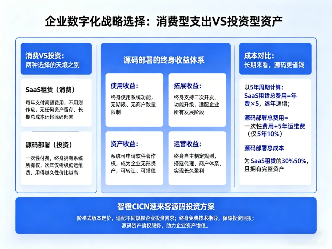 •SaaS租赁(消费):每年支付高额费用,不用则作废,无任何资产留存,长期总成本远超源码部署;