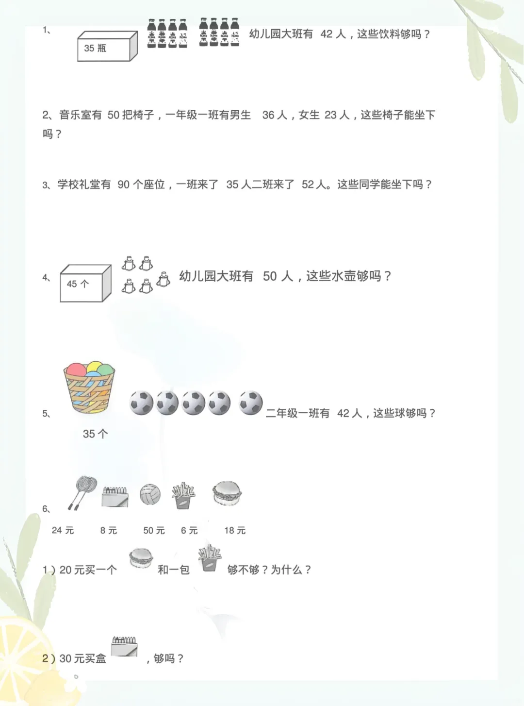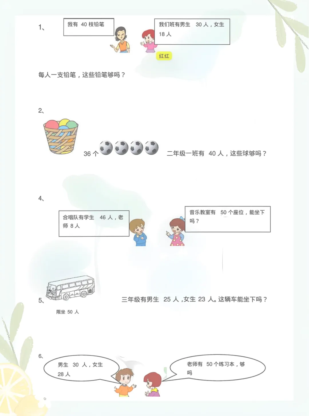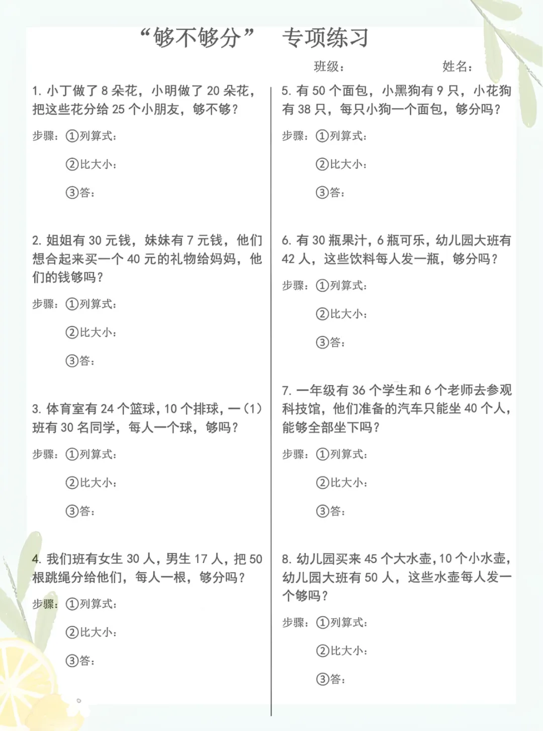 一年级下册数学《够不够分专项练习》,共4页,电子版可下载可打印,这份练习紧扣一年级数学“够不够分”相关内容,结合基础应用与专项训练,帮助孩子在练习中理解数量比较、实际分配等思路,进一步巩固课堂所学,提升分析与解决问题的能力。篇幅精简,适合日常练习与查漏补缺,需要的家长可以赶紧保存打印出来,让孩子练一练。