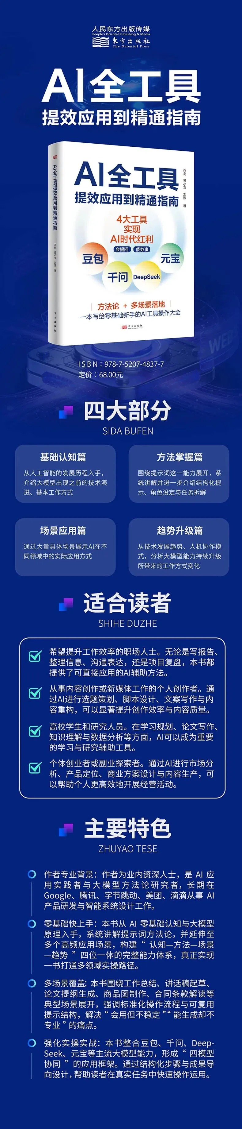 《AI全工具提效应用到精通指南》 往期链接: 《AI全工具提效应用到精通指南》是一本系统讲解豆包、千问、DeepSeek、元宝等人工智能如何提升个人效率的实战型指南 《OpenClaw:从入门到精通应用操作大全》0基础快速入门,从核心原理、安装方法到安全操作,一本书讲透包含国内 WorkBuddy、ArkClaw等操作