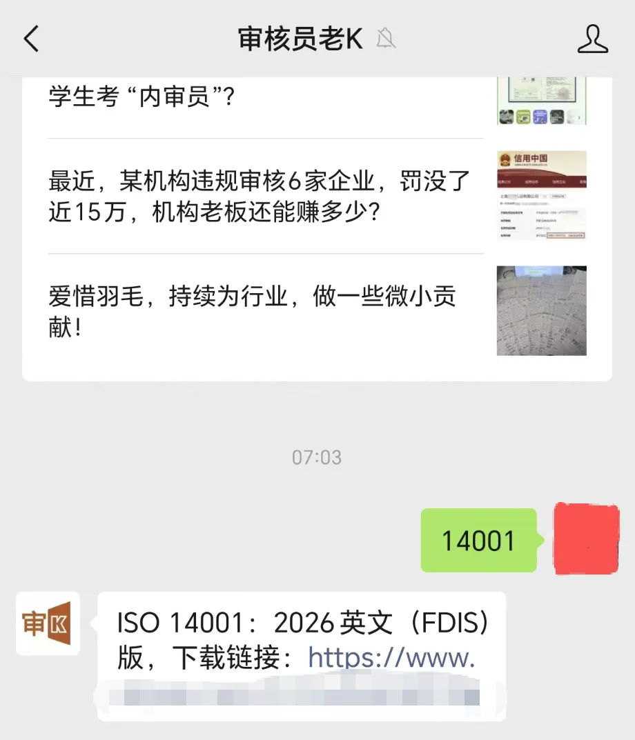 最新版!ISO 14001:2026标准免费下载! 本次提供下载的版本ISO 14001:2026英文(FDIS)版 【下载方式2步走】 ↓①关注下方公众号↓ ②在新关注公众号(审核员老K)后台 回复关键字:14001,即刻获得下载链接 【操作方式,如上图】 |编辑:审核员老K |微信:153 8062 8481 |图片:网络 学习链接,点击“阅读原文”