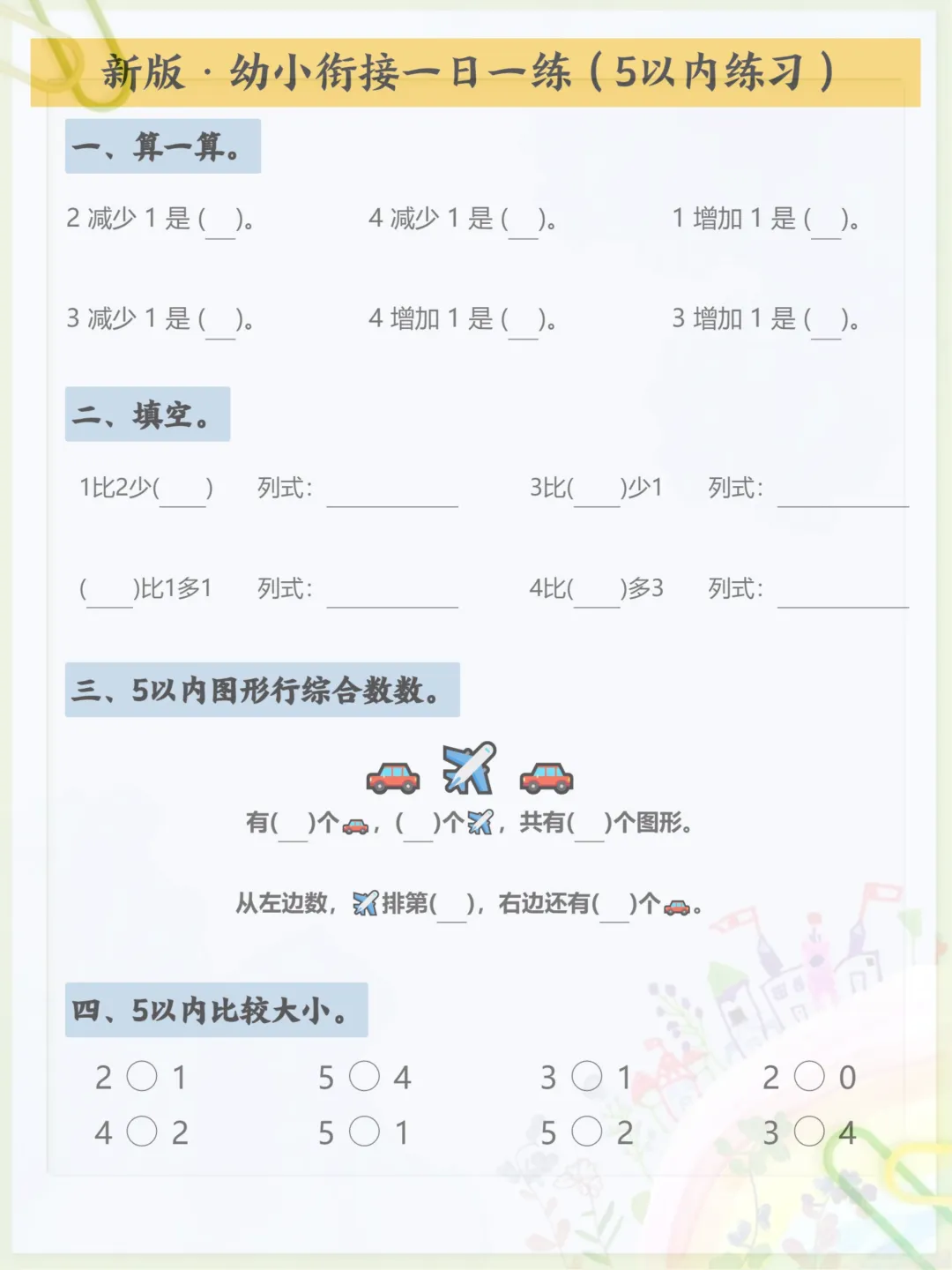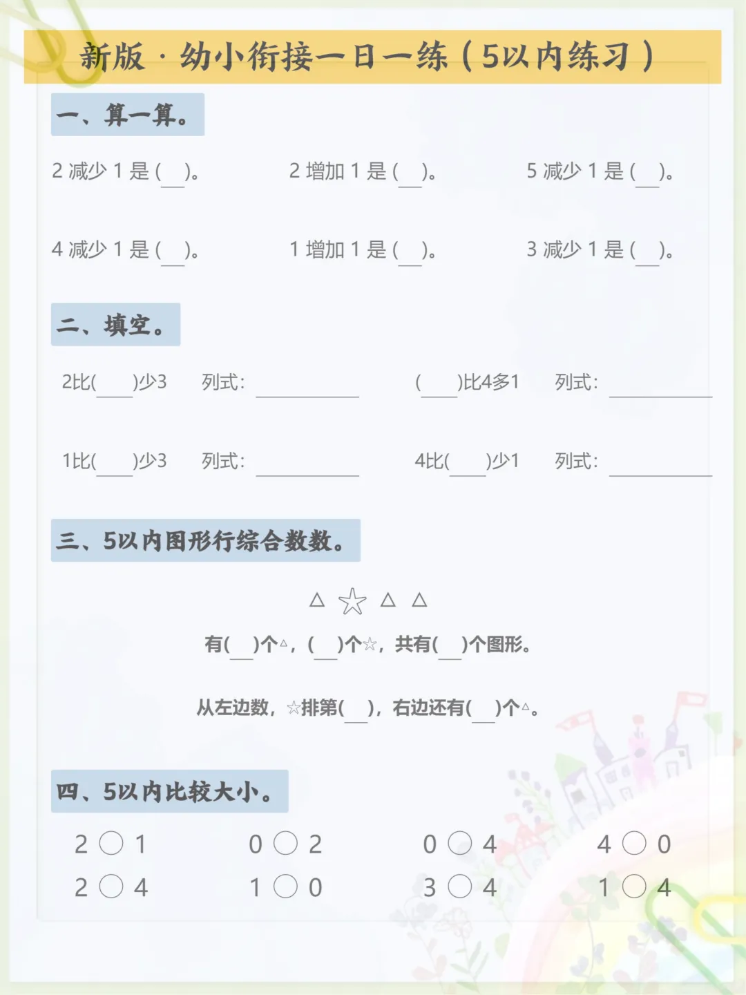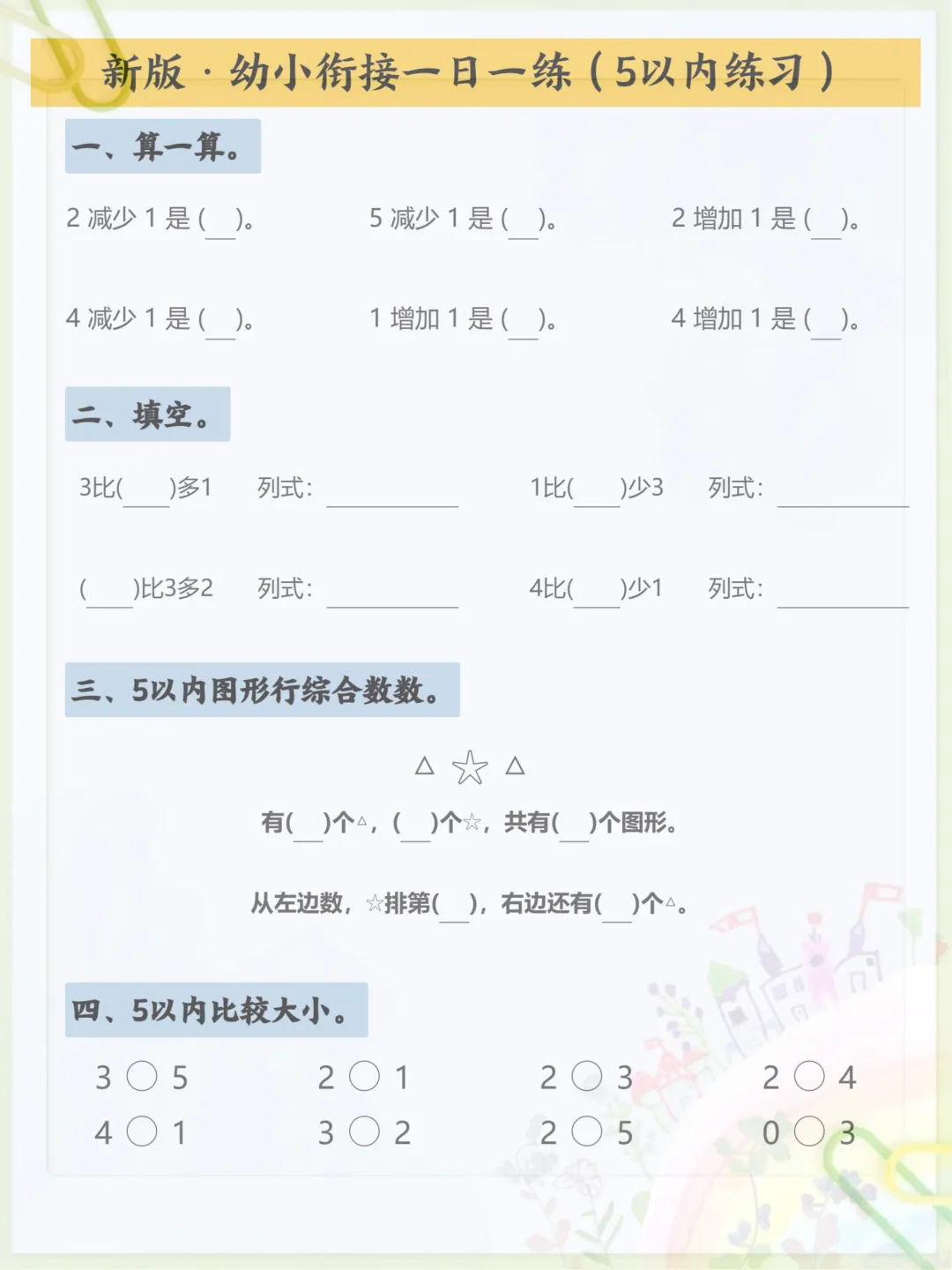 新版·幼小衔接一日一练(5以内练习)五,共5页,电子版可下载可打印,这份幼小衔接专项练习围绕5以内练习内容设计,帮助孩子在入学前进一步熟悉基础数学启蒙训练,逐步巩固相关认知与练习能力,内容贴近日常练习节奏,方便家长在家陪练、随时打印使用。需要的家长可以提前备好,让孩子每天练一练,轻松做好幼小衔接。