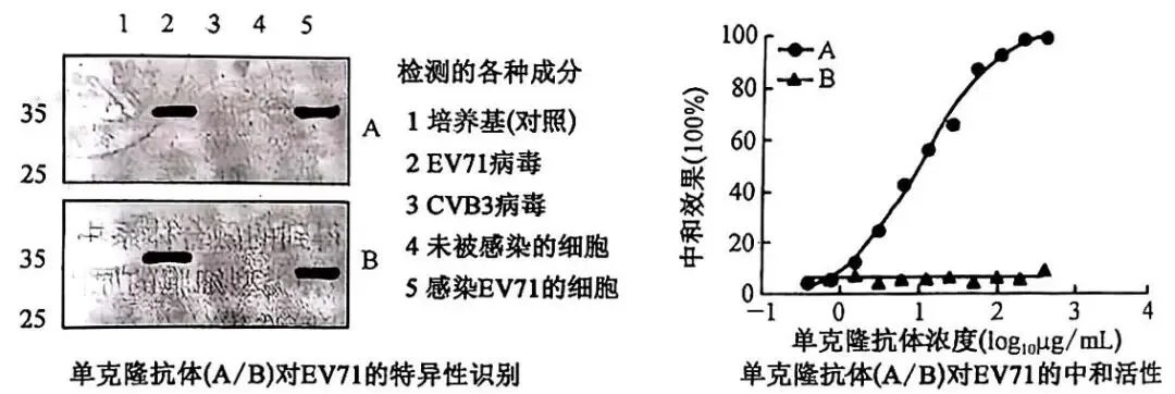 8.肠道病毒71型(EV71)为单股正链RNA病毒,是引起手足口病的主要病原体之一、在EV71中,结构蛋白1(VP1)为主要的中和抗原(中和抗原与中和抗体结合后能阻止病原体入侵与增殖)。研究人员以VP1蛋白为抗原制备出单克隆抗体A、B,并对两种单克隆抗体的作用效果进行检测,结果如图。下列相关叙述正确的是