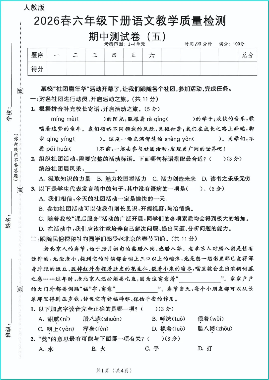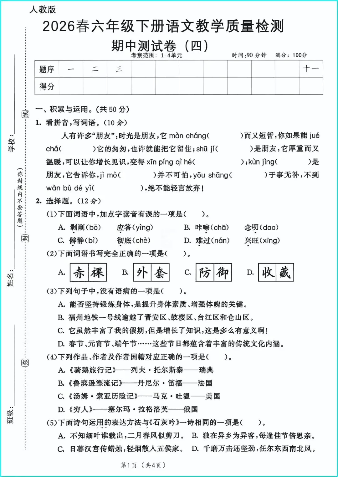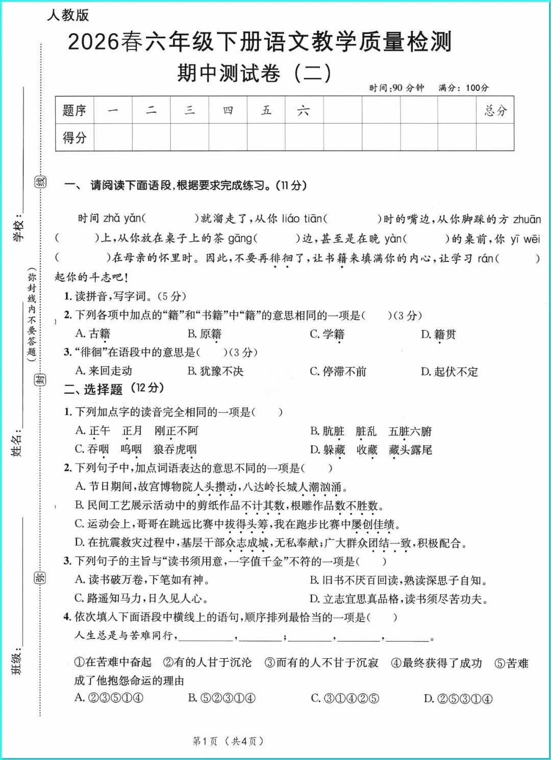 2026年人教部编版六年级下册(语文)《期中考试综合达标测试卷》(共5套•含答案)高清可打印