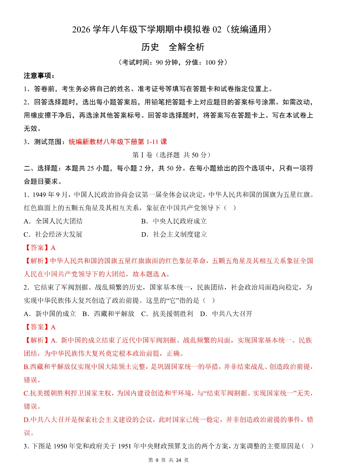 今日给家长朋友们分享的是:2026年新八年级下册初二统编版历史《期中培优测试卷》含答案解析‖电子版可打印