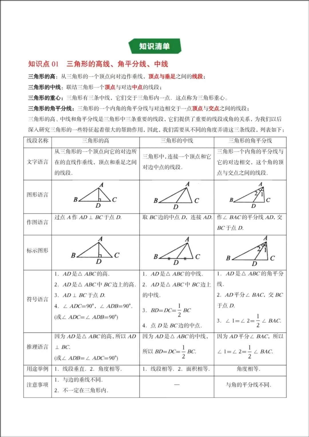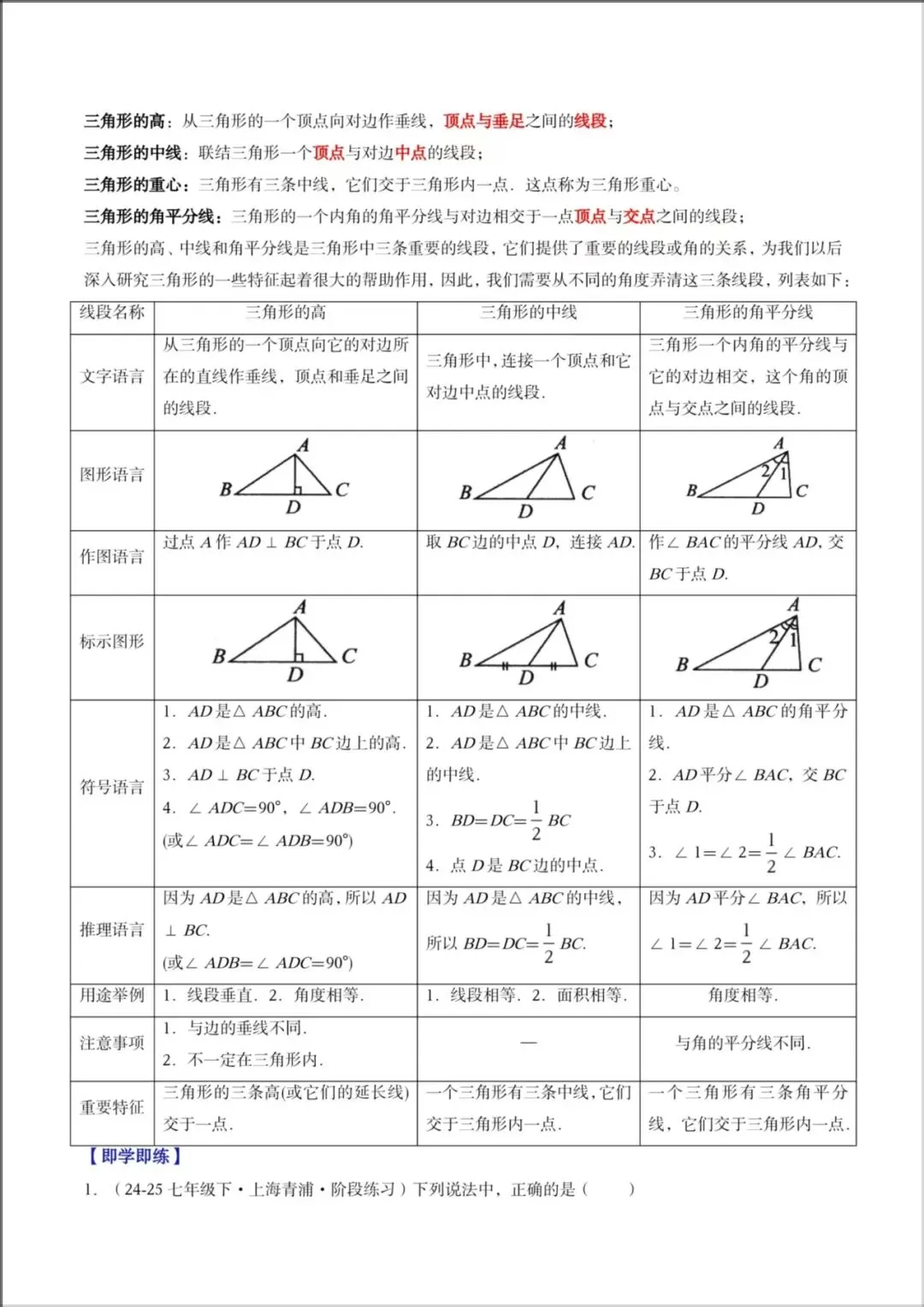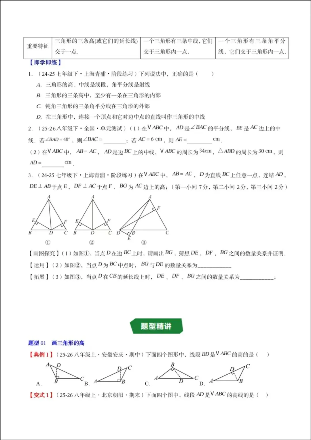 2026春新版教材【北师版】七年级下册〈数学〉同步讲义《三角形中的高线、中线、角平分线》知识清单+题型精讲,可下载打印!