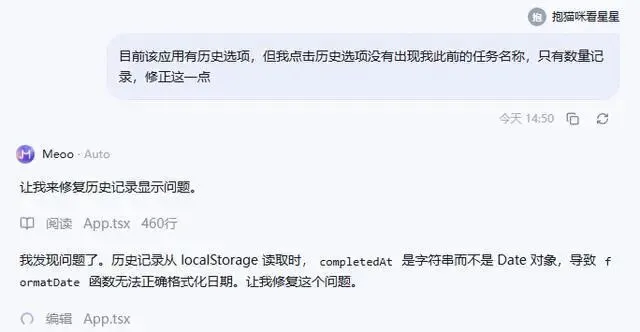 新京报贝壳财经记者实测,约 3 分钟即可生成一个可用的待办计时 Web 应用。Meoo 在编码前会主动提出 4 个澄清问题,然后自动生成代码,遇到 bug 还能自行排查修复。