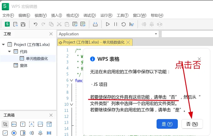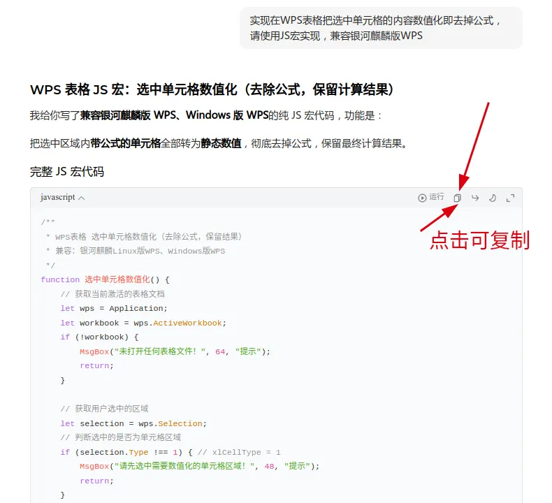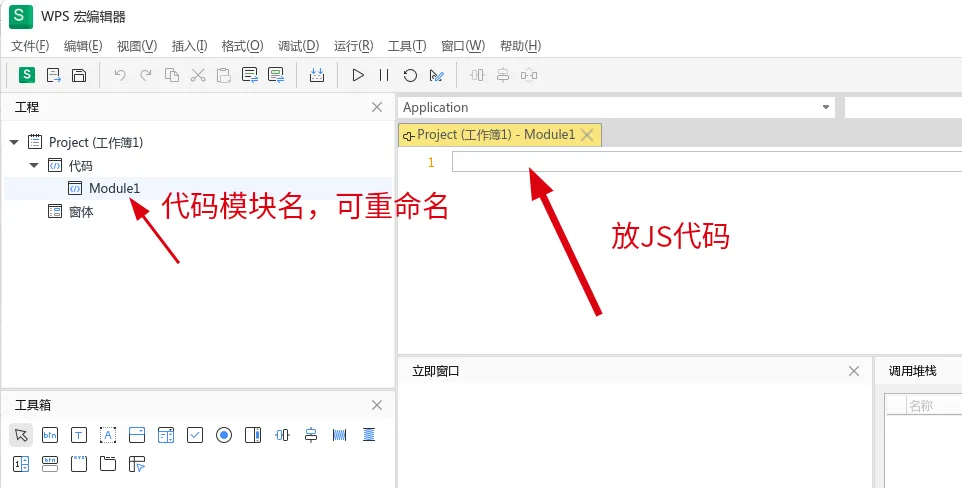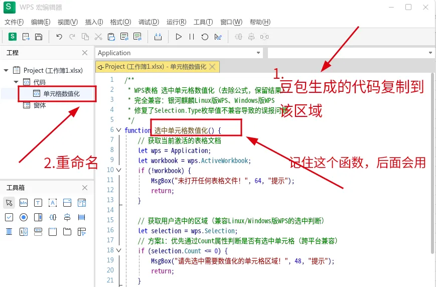 4.将豆包生成的完整代码复制到宏编辑器放JS代码的区域,并给代码模块重命名