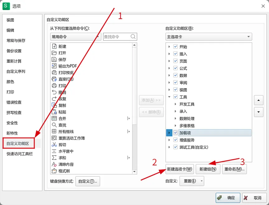 7.打开Excel表格,文件->选项->自定义功能区->新建选项卡—>新建组