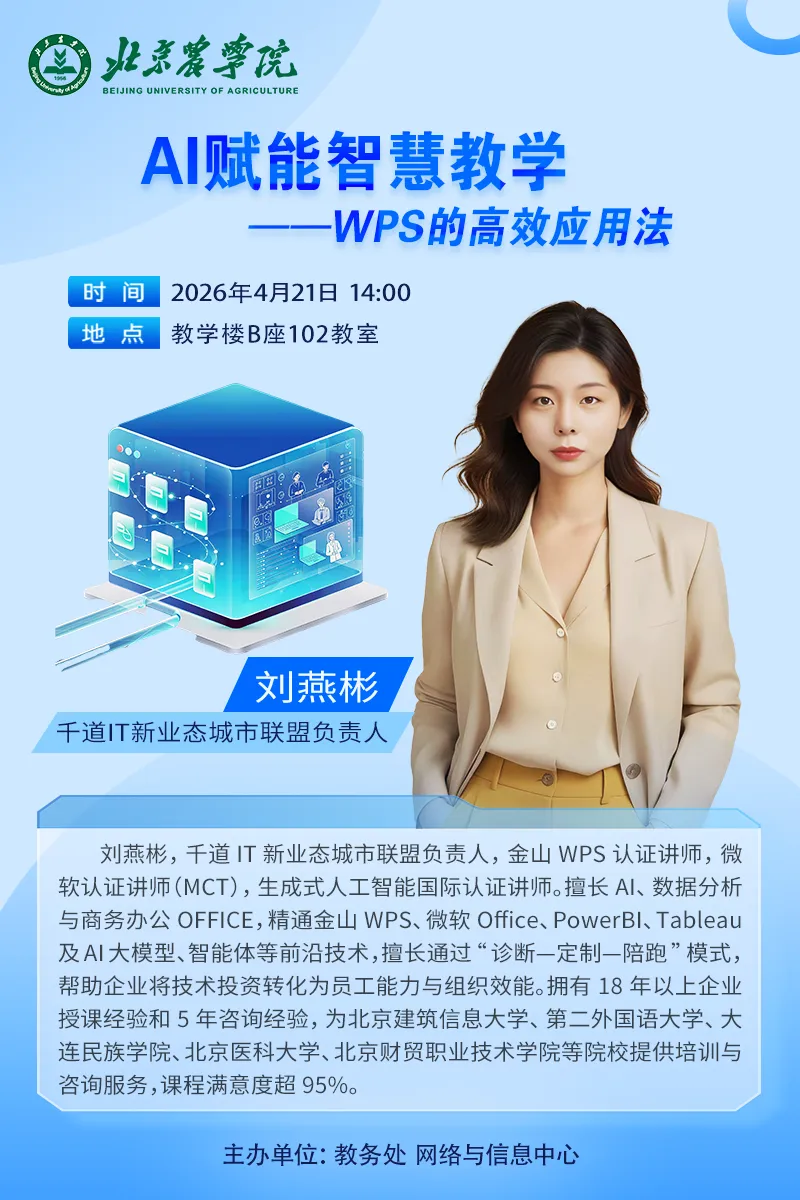 刘燕彬,千道IT新业态城市联盟负责人,金山WPS认证讲师,微软认证讲师(MCT),生成式人工智能国际认证讲师。擅长AI、数据分析与商务办公OFFICE,精通金山WPS、微软Office、PowerBI、Tableau及AI大模型、智能体等前沿技术。