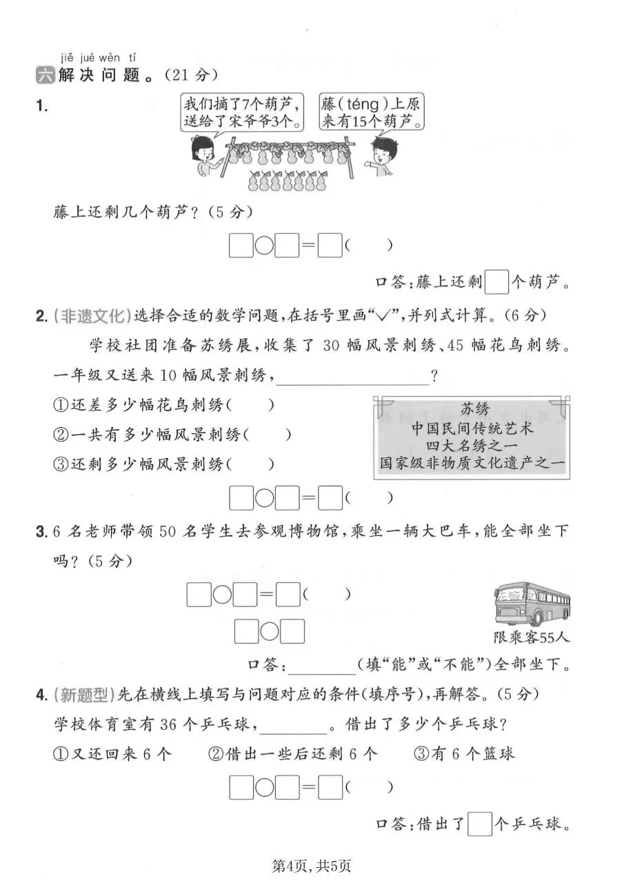 涵盖排队问题(间隔数=人数-1);生活中的加减法应用(葫芦剩余、苏绣数量、乘车限乘、乒乓球借出);根据问题选条件补全题目;“多得多、少一些”的实际应用;简单的两步计算问题,培养审题与逻辑推理能力。