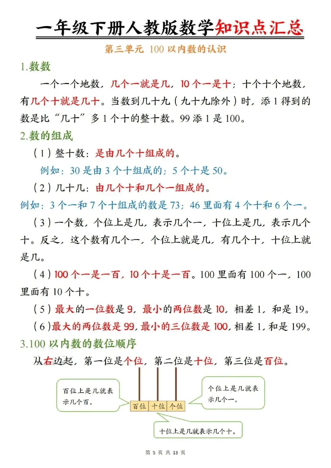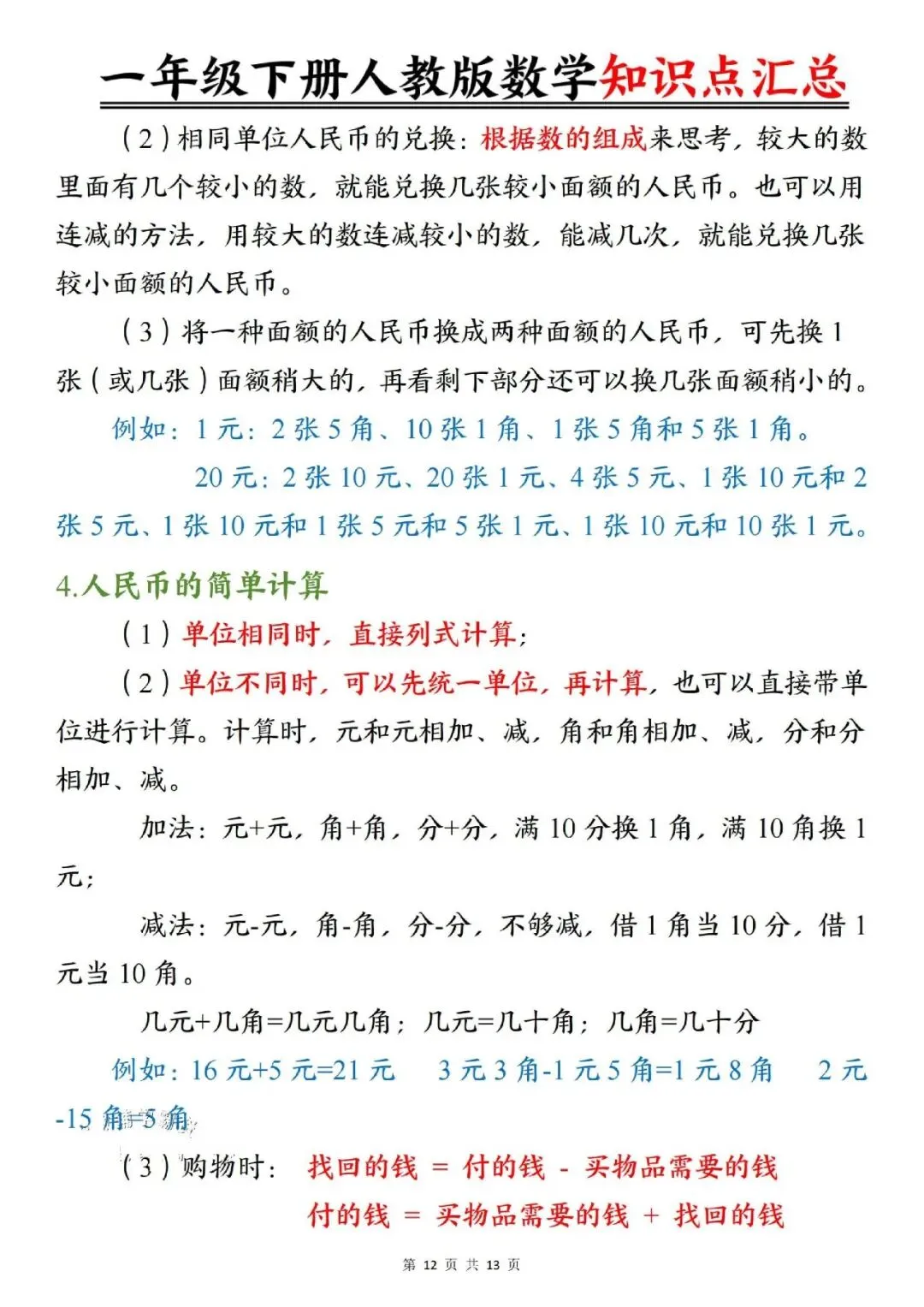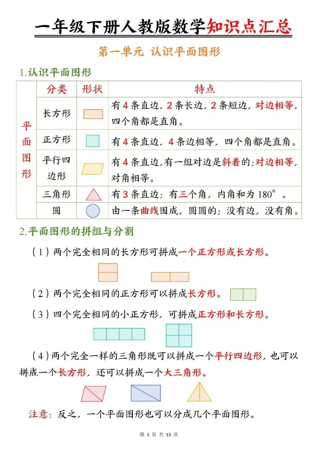 一年级下册数学知识点总结可打印 大家好,这里是淘学学资料库,这份《一年级下册人教版数学知识点汇总》,完整 pdf 电子档共 13 页。 这份资料全面整理一年级下册人教版数学全部核心知识点,按单元划分,包含认识平面图形、20 以内退位减法、100 以内数的认识、口算笔算加减法、数量关系、人民币认识等内容,用表格、口诀、例题清晰讲解,重点突出、通俗易懂,方便孩子快速梳理知识框架。 这份汇总把课本重难点、计算方法、解题规律、单位换算全部提炼出来,配有典型例题与解题步骤,涵盖图形拼组、破十法、百数表规律、进退位笔算、人民币计算等必考内容,适合孩子课前预习、课后复习、考前查漏补缺,帮助孩子系统掌握知识,夯实数学基础,提升解题能力。 (公众号底部菜单查看完整pdf获取方式) 01 截图预览 (因篇幅有限,仅展示部分内容) 02 文件目录 一年级下册人教版数学知识点汇总.PDF (13页) 03 获取方式 公众号底部菜单查看完整pdf获取方式 END