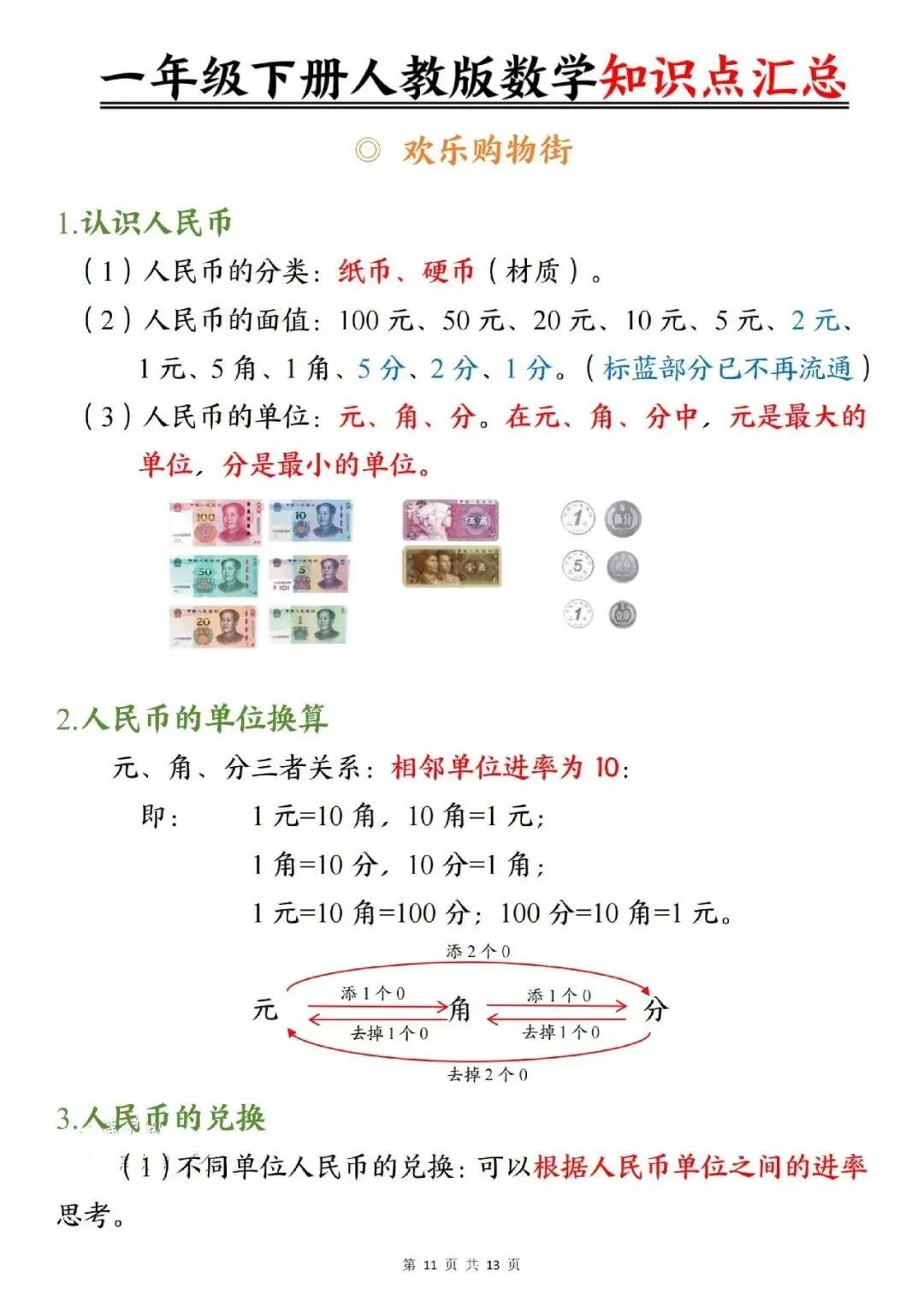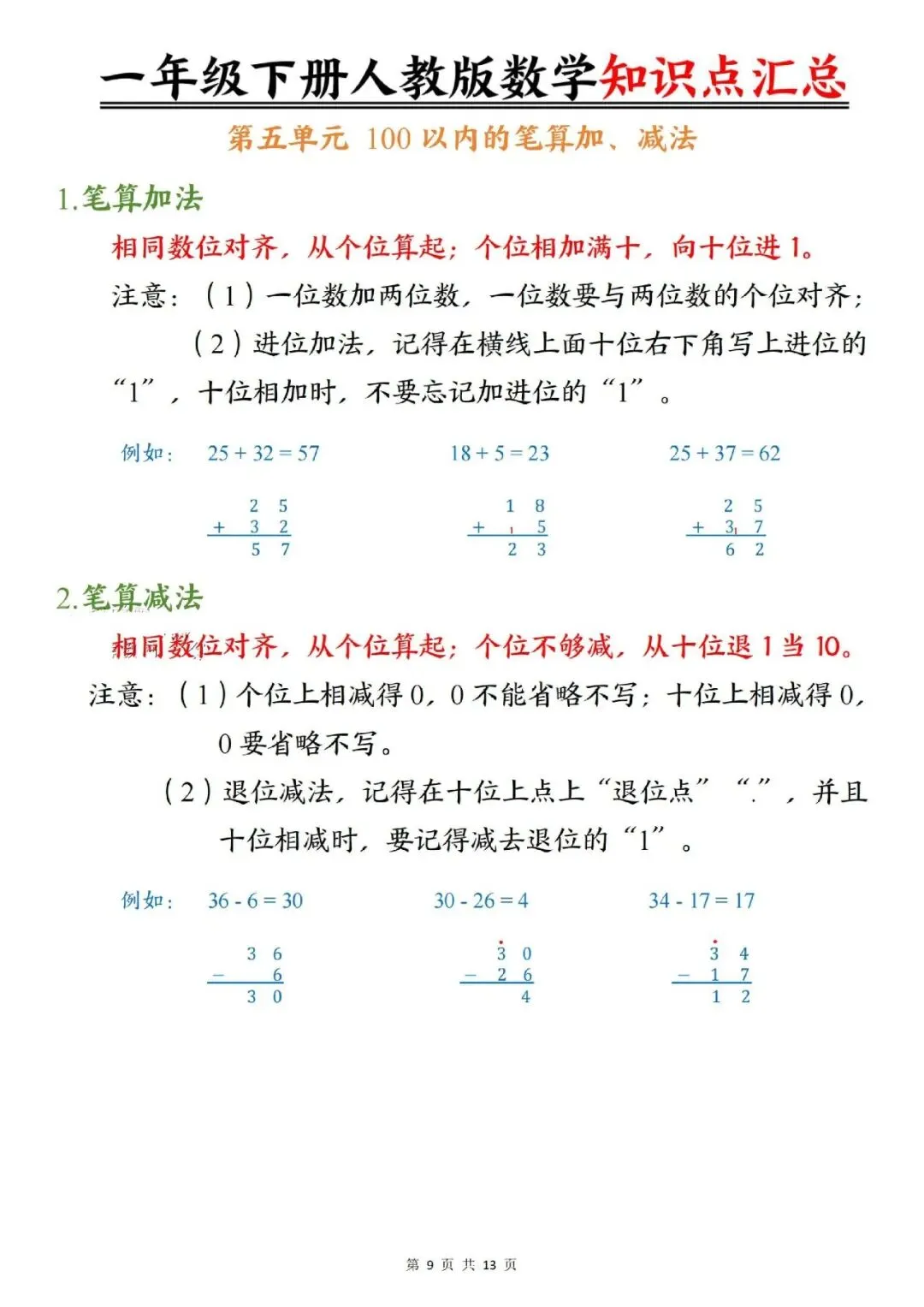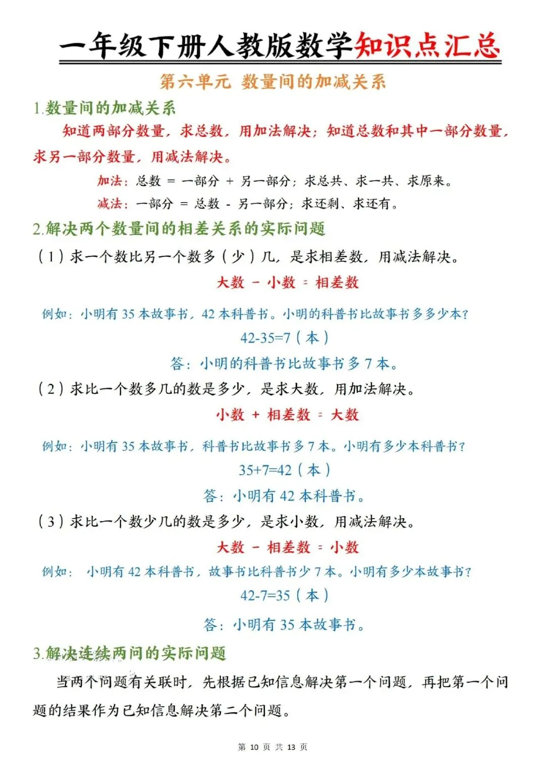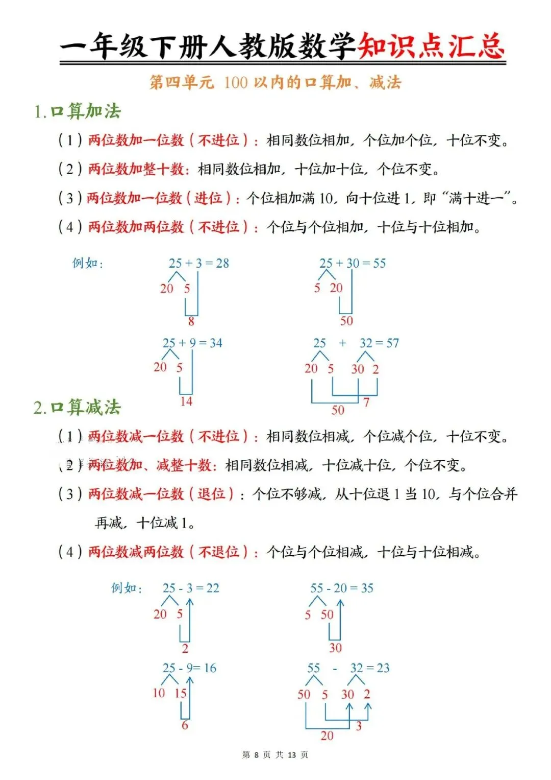 一年级下册数学知识点总结可打印 大家好,这里是淘学学资料库,这份《一年级下册人教版数学知识点汇总》,完整 pdf 电子档共 13 页。 这份资料全面整理一年级下册人教版数学全部核心知识点,按单元划分,包含认识平面图形、20 以内退位减法、100 以内数的认识、口算笔算加减法、数量关系、人民币认识等内容,用表格、口诀、例题清晰讲解,重点突出、通俗易懂,方便孩子快速梳理知识框架。 这份汇总把课本重难点、计算方法、解题规律、单位换算全部提炼出来,配有典型例题与解题步骤,涵盖图形拼组、破十法、百数表规律、进退位笔算、人民币计算等必考内容,适合孩子课前预习、课后复习、考前查漏补缺,帮助孩子系统掌握知识,夯实数学基础,提升解题能力。 (公众号底部菜单查看完整pdf获取方式) 01 截图预览 (因篇幅有限,仅展示部分内容) 02 文件目录 一年级下册人教版数学知识点汇总.PDF (13页) 03 获取方式 公众号底部菜单查看完整pdf获取方式 END