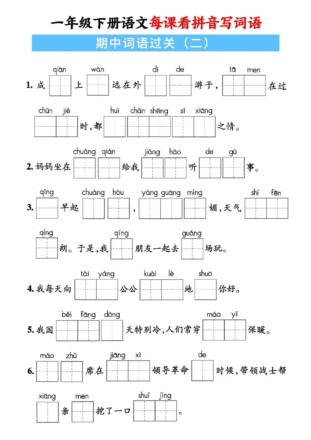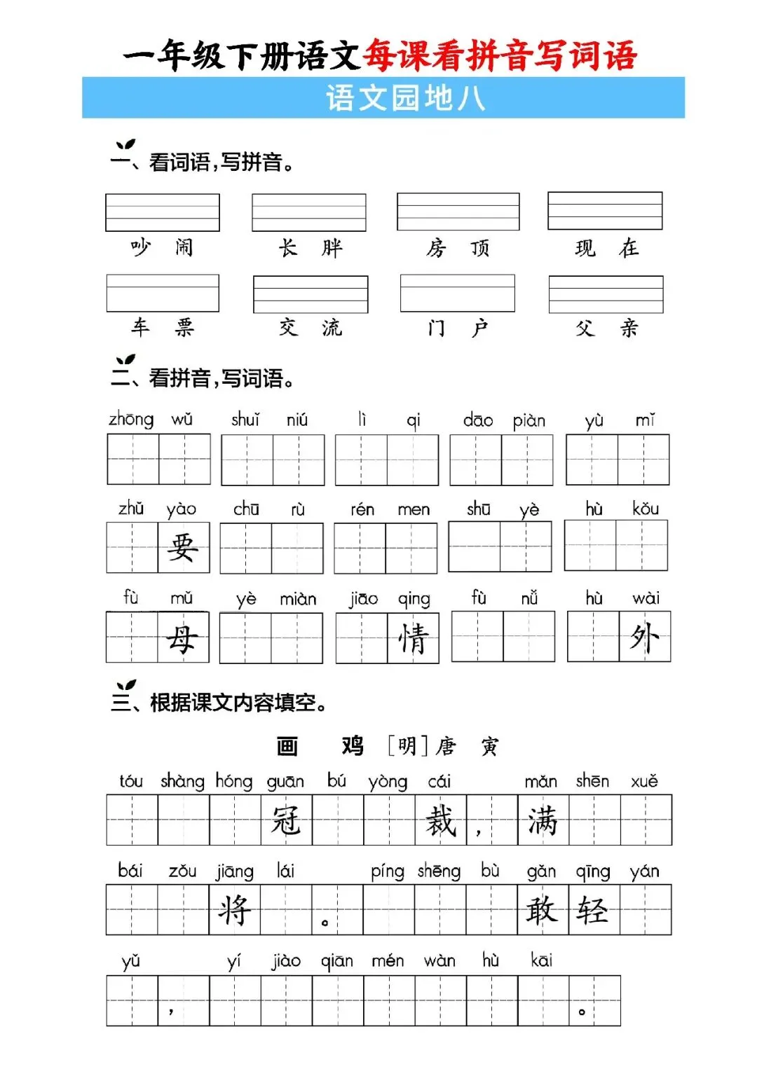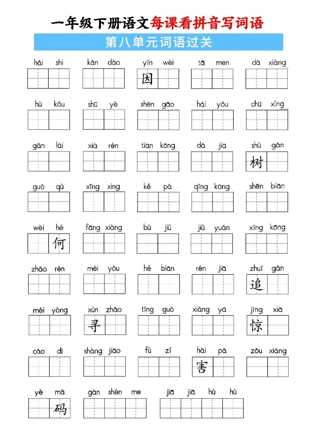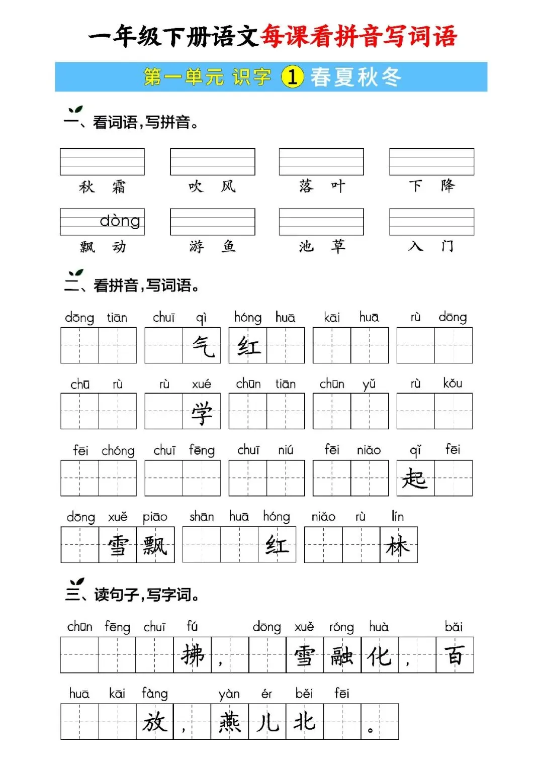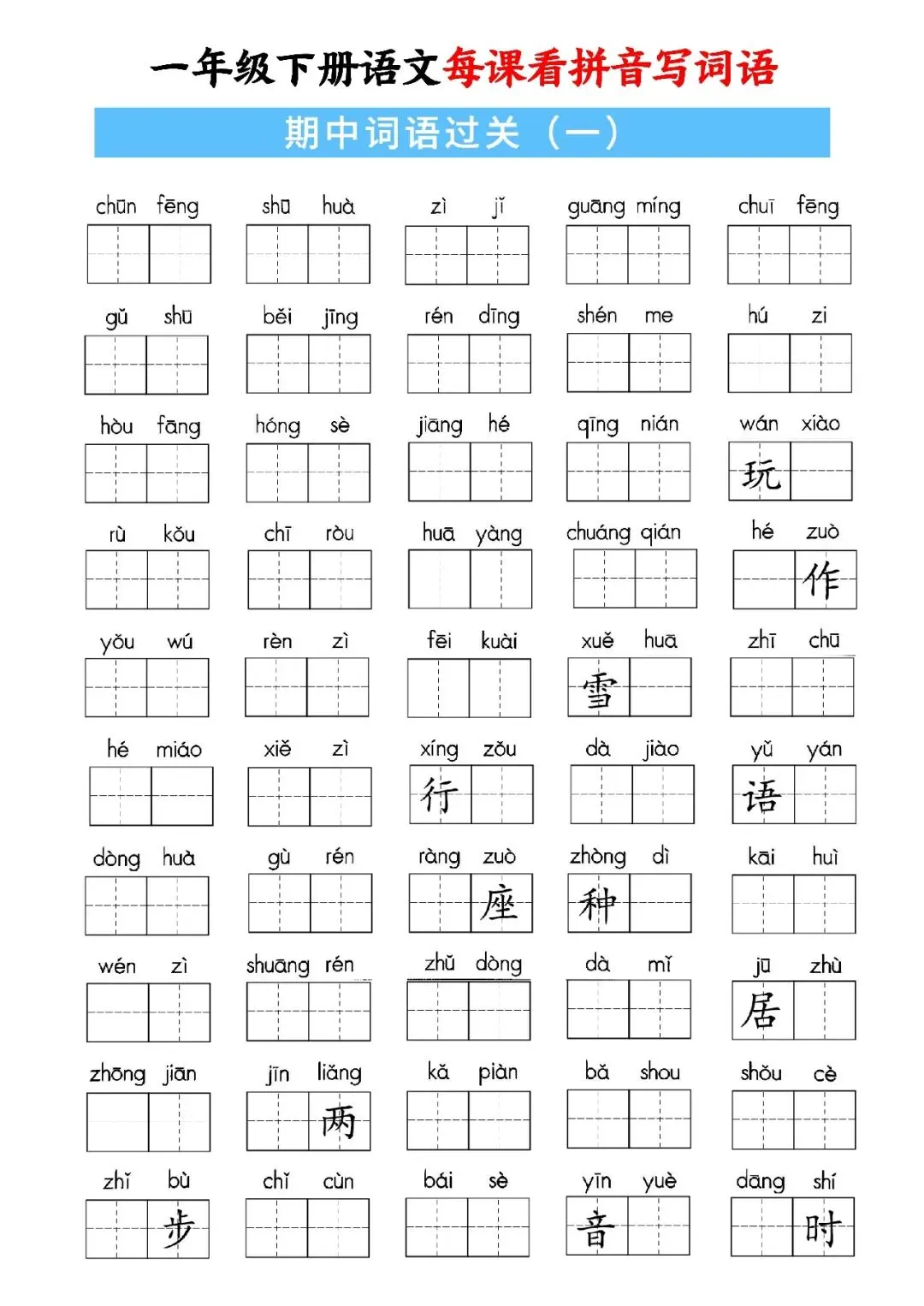 大家好,这里是淘学学资料库,这份《一年级下册语文每课看拼音写词语》,完整 pdf 电子档共59页。这份资料同步一年级下册语文全册课文,按单元与课时编排,包含每课看拼音写词语、词语注音、句子填词、单元过关、期中期末专项练习等内容,覆盖课本全部必会生字词,题型贴合日常作业与考试,附带完整答案,方便孩子每日默写巩固。这份资料按课时循序渐进,从基础字词到句子运用再到综合过关,全面训练孩子拼音认读、汉字书写与词语运用能力,每天练习一页就能扎实掌握课本词语,既能夯实识字写字基础,又能提升拼读与书写规范度,适合课前预习、课后复习、期中期末冲刺,是孩子巩固语文基础、减少错别字的实用资料。
