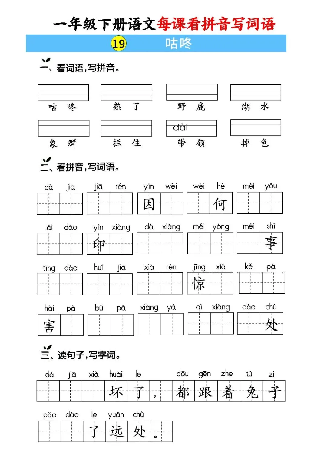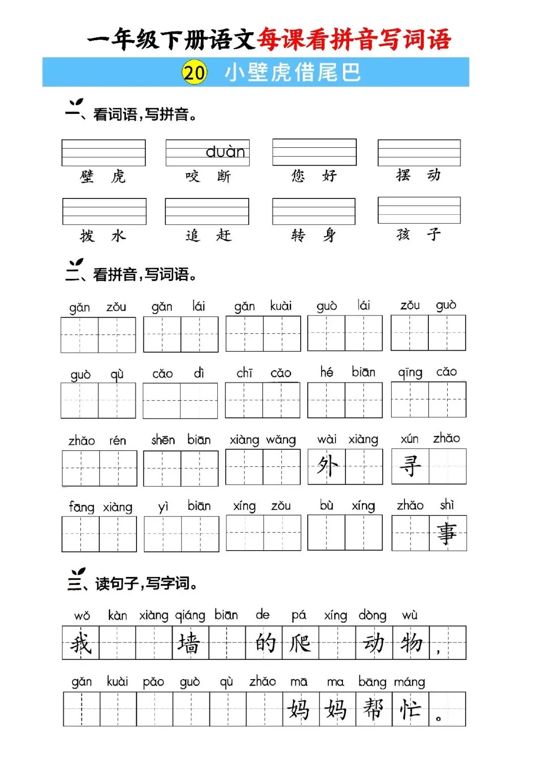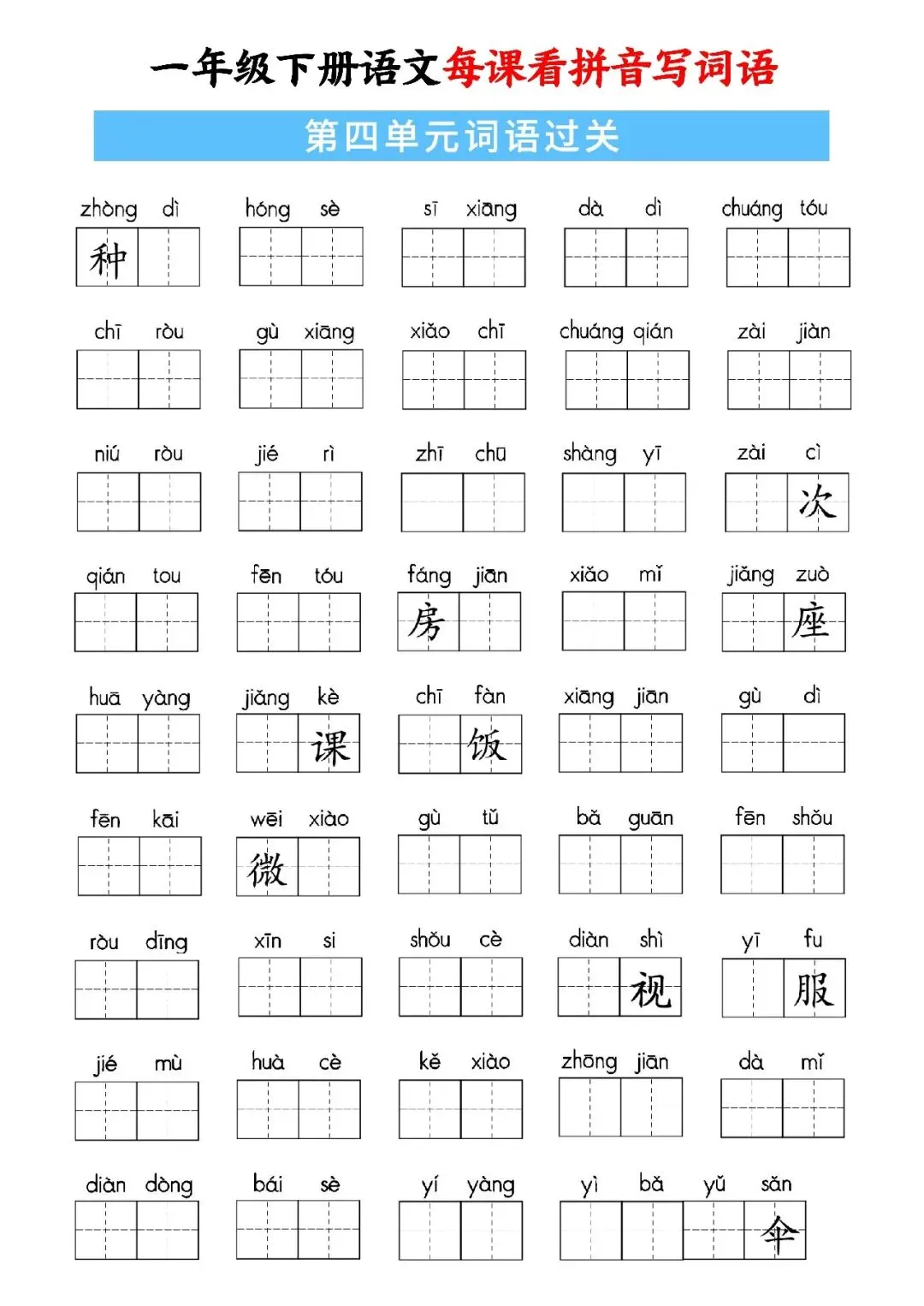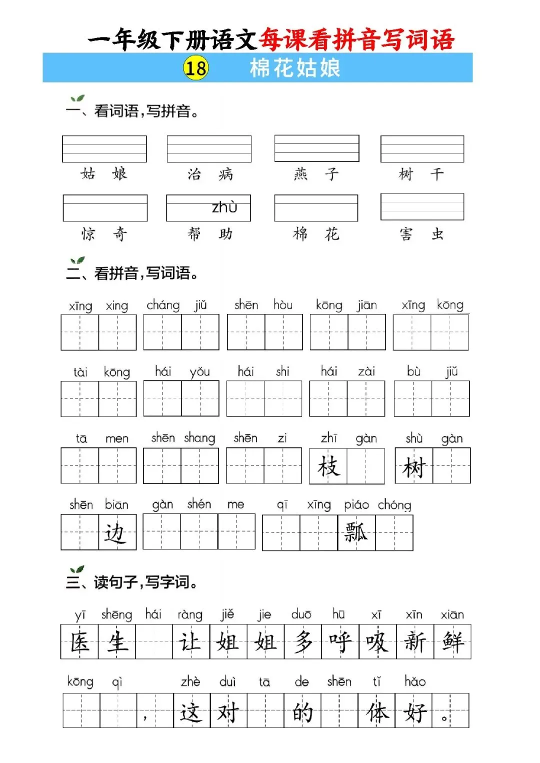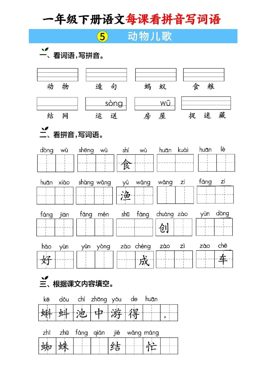 大家好,这里是淘学学资料库,这份《一年级下册语文每课看拼音写词语》,完整 pdf 电子档共59页。这份资料同步一年级下册语文全册课文,按单元与课时编排,包含每课看拼音写词语、词语注音、句子填词、单元过关、期中期末专项练习等内容,覆盖课本全部必会生字词,题型贴合日常作业与考试,附带完整答案,方便孩子每日默写巩固。这份资料按课时循序渐进,从基础字词到句子运用再到综合过关,全面训练孩子拼音认读、汉字书写与词语运用能力,每天练习一页就能扎实掌握课本词语,既能夯实识字写字基础,又能提升拼读与书写规范度,适合课前预习、课后复习、期中期末冲刺,是孩子巩固语文基础、减少错别字的实用资料。