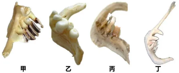 解析:草鱼梳状齿;鲢鱼滤食齿;金鱼臼齿;翘嘴红鲌尖锐齿。