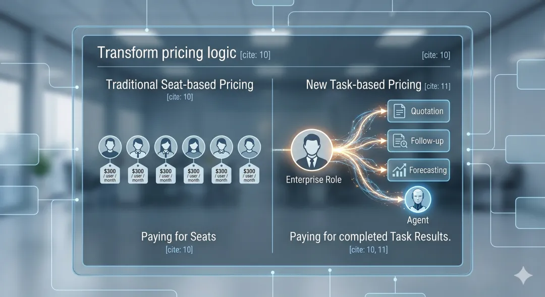 所以,真正被改写的不是产品形态,而是商业逻辑。Seat-based 的时代里,一个人对应一个账号;Agent 时代里,一个岗位背后可能挂着多个数字劳动力。一个销售,身后可以有跟进 agent、报价 agent、纪要 agent、预测 agent;一个财务,也可以同时配备对账 agent、风控 agent、报表 agent。企业买的将不再只是“多少人用软件”,而是“多少个任务闭环在系统里被自动完成”。