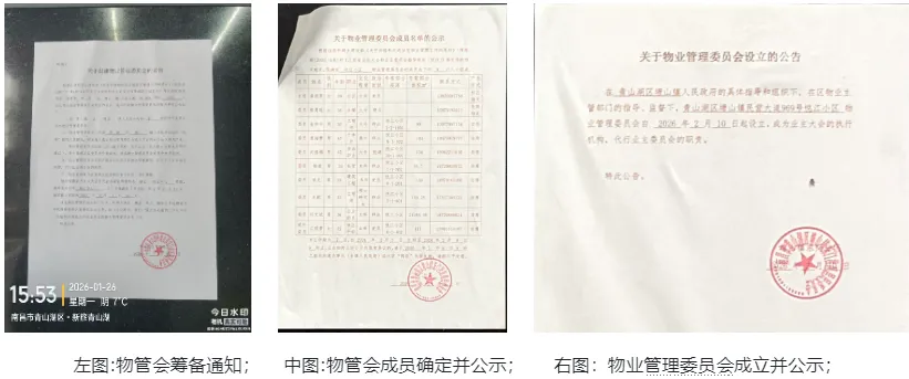 2026年1月26日在小区门卫处张贴物管会筹备通知,接受全体邻居的自荐和推荐;2026年2月2日在东门社区进行物管会成员评选会,确定包含社区政府、乡镇政府、开发商、小区业主、候选委员在内的共10名成员组建物业管理委员会并进行公示,公示期为7日;2026年2月10日,小区物业管理委员会正式设立。