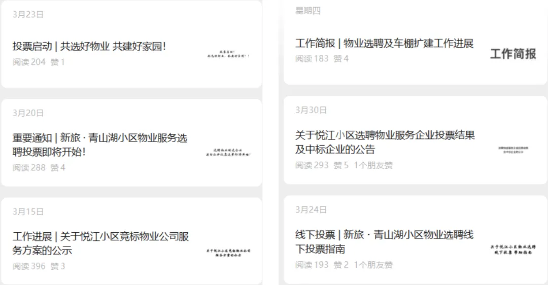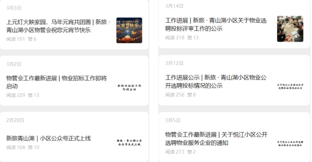 为保障物管会工作内容的及时传达,并方便各位小区业主快速获取,物管会主导成立业主微信群并注册了微信公众号用于信息公开。截至2026年4月13日,物管会已经从楼栋小区群、新旅物业管家转发、开发商及新旅物业创建的<新旅青山湖业主群@新建大群>、小区门岗处等多个渠道针对公众号进行推广,累计关注人数达392人,发表公众号推文12篇,阅读总人数3450人(每个推文会重新记录叠加一次人数)。
