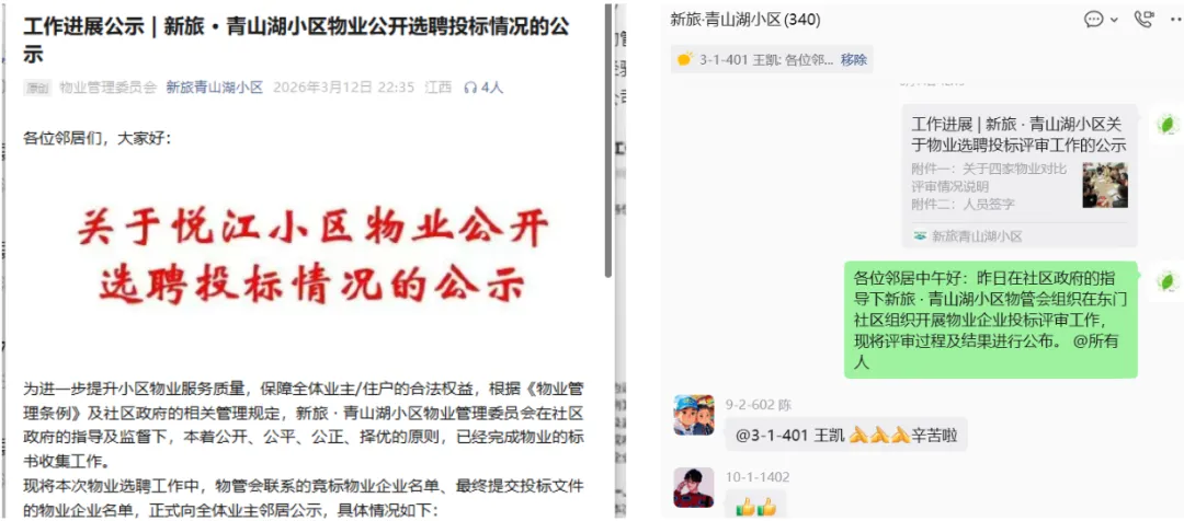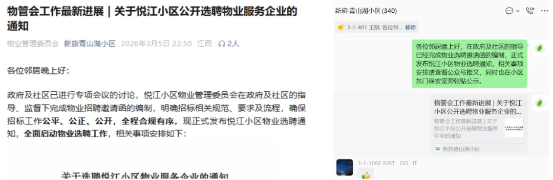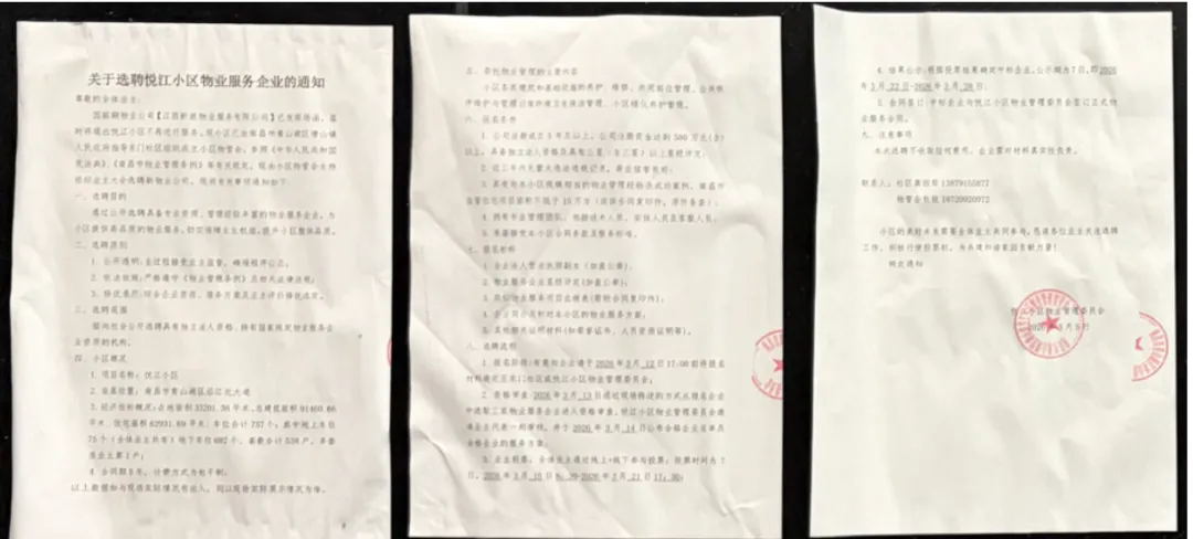 1)《关于悦江小区公开选聘物业服务企业的通知》于2026年3月5日将相关通知同步在微信公众号、微信群发布及在小区门卫处张贴。