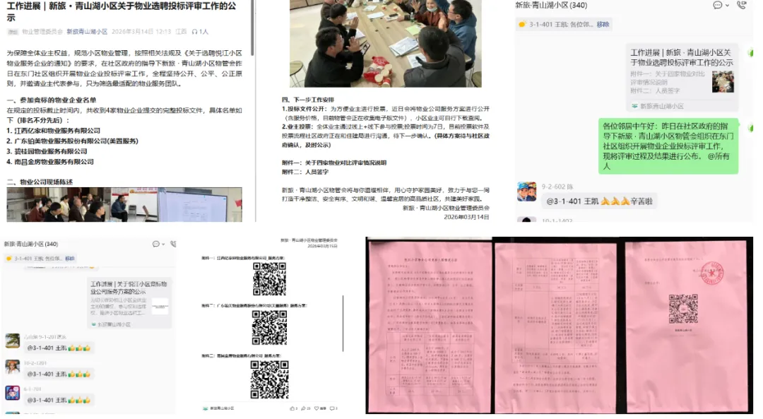 1)3 月 13 日在东门社区组织公开评审,江西亿家和、广东铂美(美置服务)、碧桂园、南昌金房 4 家物业参与现场陈述与质询,小区物管会成员(9名)、业主代表(2名)及热心业主(3名)公开投票,确定江西亿家和、广东铂美(美置服务)、南昌金房 3 家物业进入业主投票环节,相关评审工作于2026年3月14日在微信公众号、微信群同步公开,并附件评审说明及人员签字。