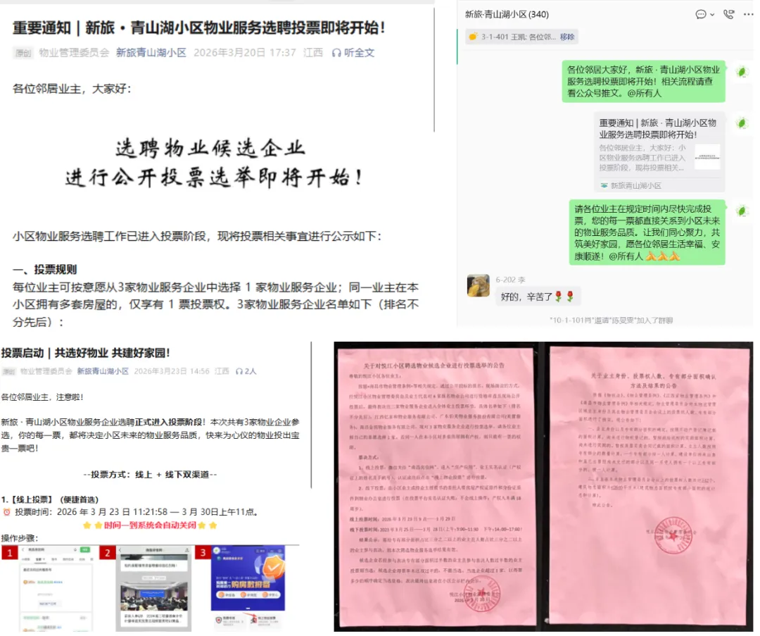 2)聘选物业企业公开投票流程公示:经与社区政府及逐渐局的沟通,小区物业服务选聘投票时间及方式于正式投票前3天(2026年3月20日)在微信公众号、小区门卫处、业主微信群同步进行公开。