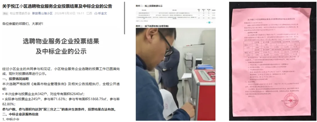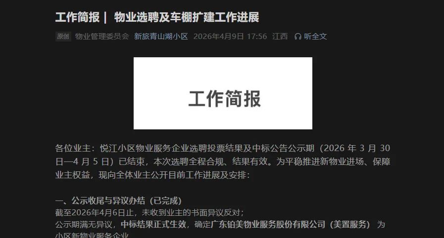 1)中标公示:经过小区业主的公开投票与见证,小区物业服务企业选聘投票工作已圆满完成,2026年3月30日在微信公众号,微信群、小区门卫处针对投票结果进行公示。