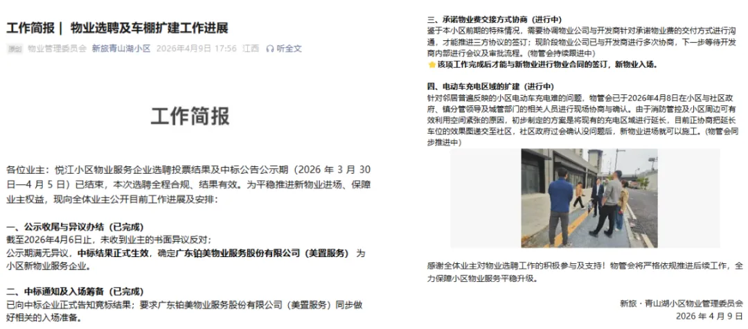 3)入场准备:同步知会广东铂美物业服务股份有限公司 (美置服务)做好入场准备,2026年4月15日美置服务工程部门提前进入小区勘验现场,入场后将会针对现场勘探报告进行小区的整改及优化。美置服务已经全面开始进行入场准备,预计将于5月中旬正式入场,请各位邻居业主敬请期待。(物管会持续跟进中)