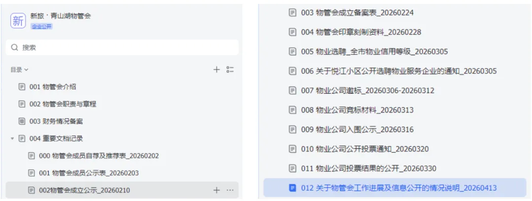 为规范物管会的相关工作流程,保证所有资料的可追溯性,我们创建了新旅 · 青山湖物管会内部飞书系统,用于物管会工作中的流程资料的存档。系统内留存的文档均为相关工作公开信息的记录,已将相关信息整理进行公开。
