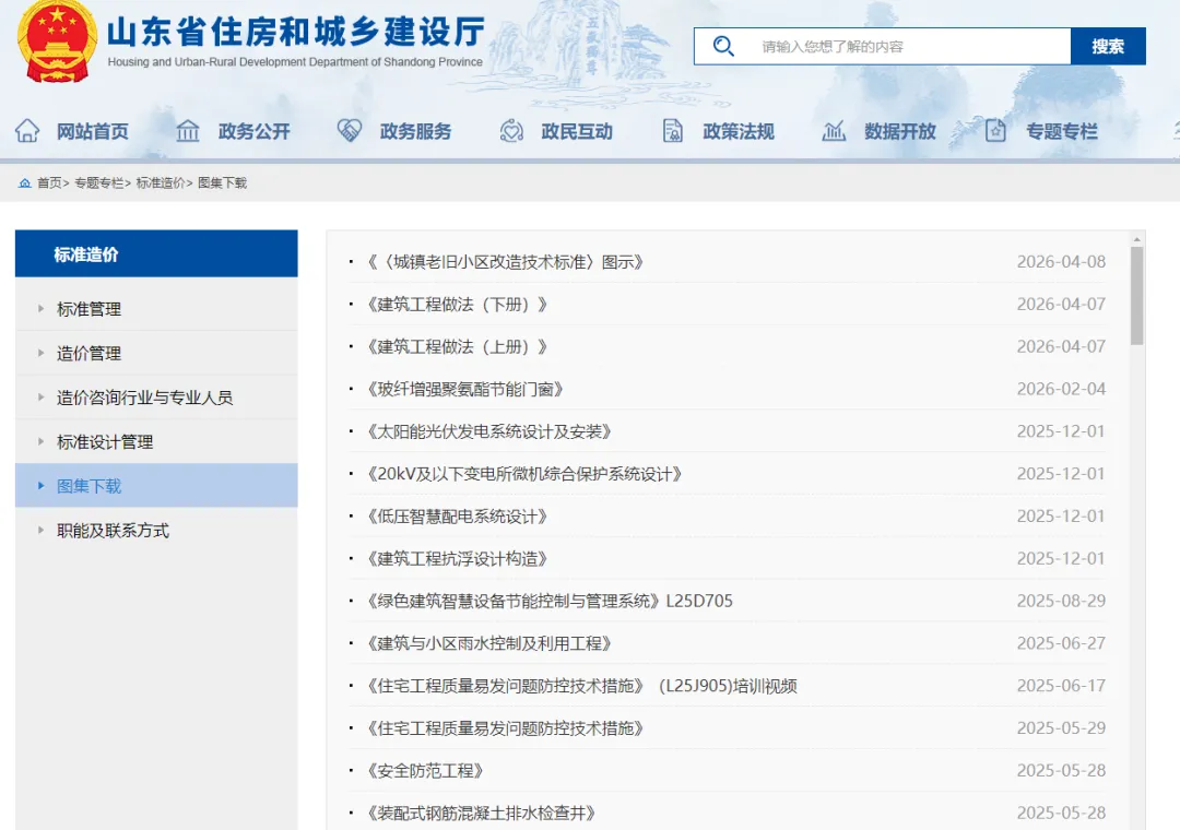 山东省住建厅官网首页 → 专题专栏 → 标准造价 → 图集下载