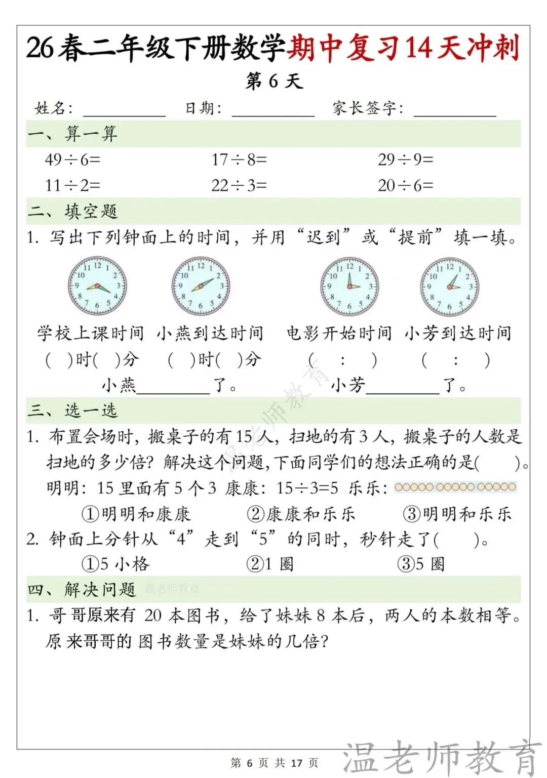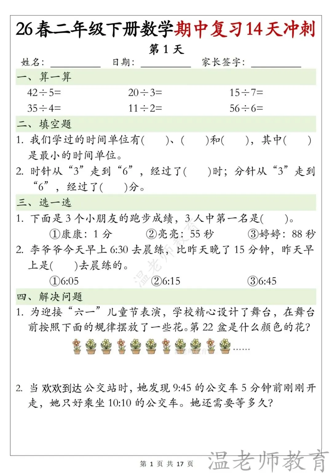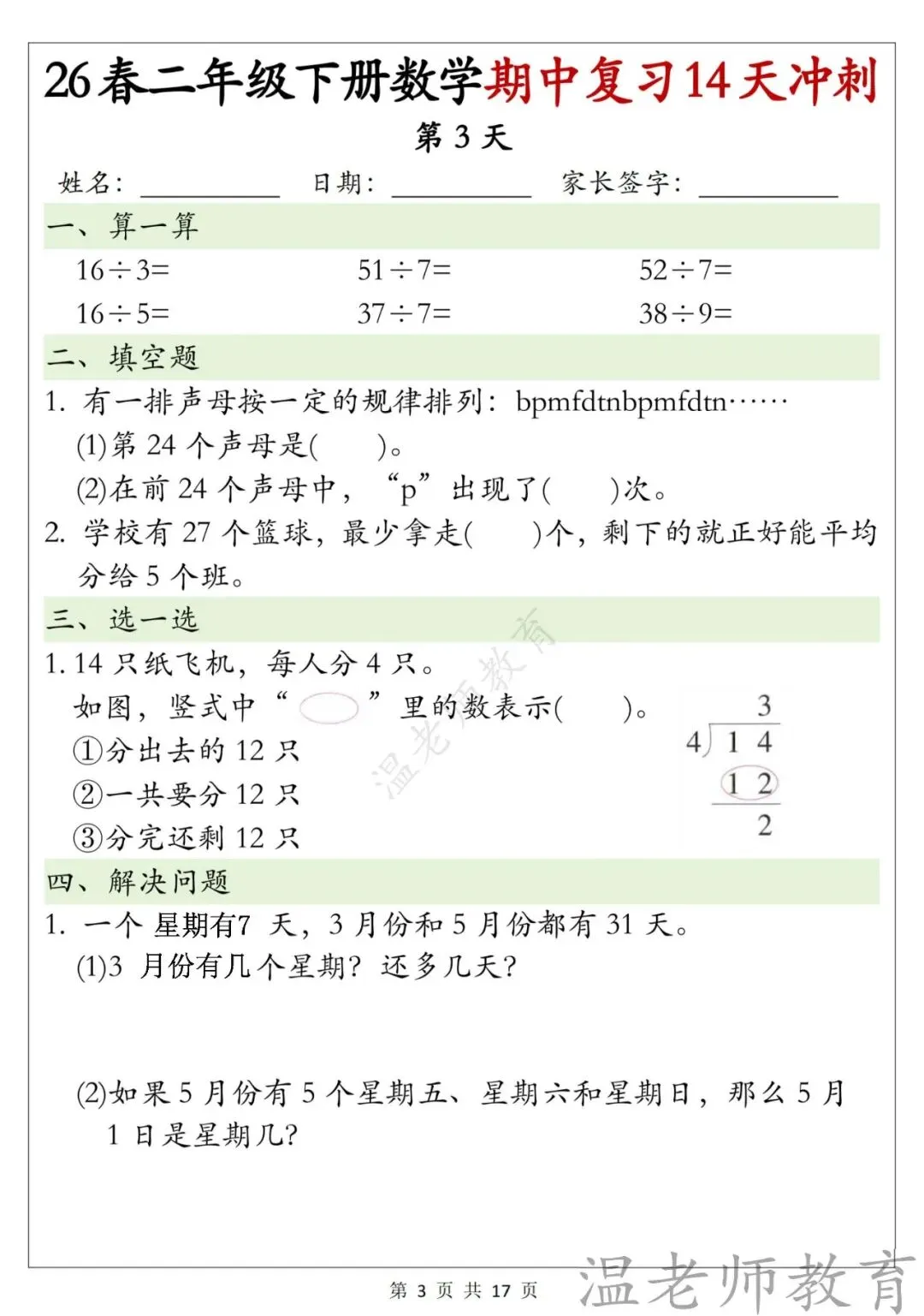 今天分享的是:二年级下册数学期中复习14天冲刺计划。这套资料包含了口算题、填空题、应用题等基础题型,每天一页,可以帮助孩子提高计算速度和准确度,是非常不错的复习材料!