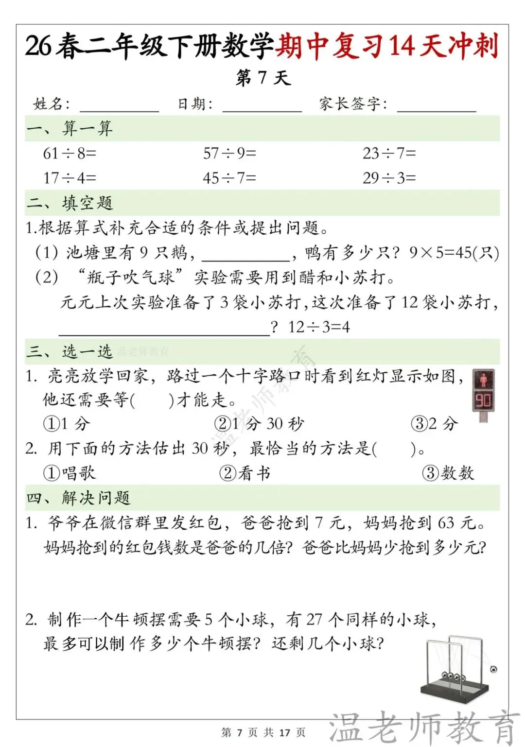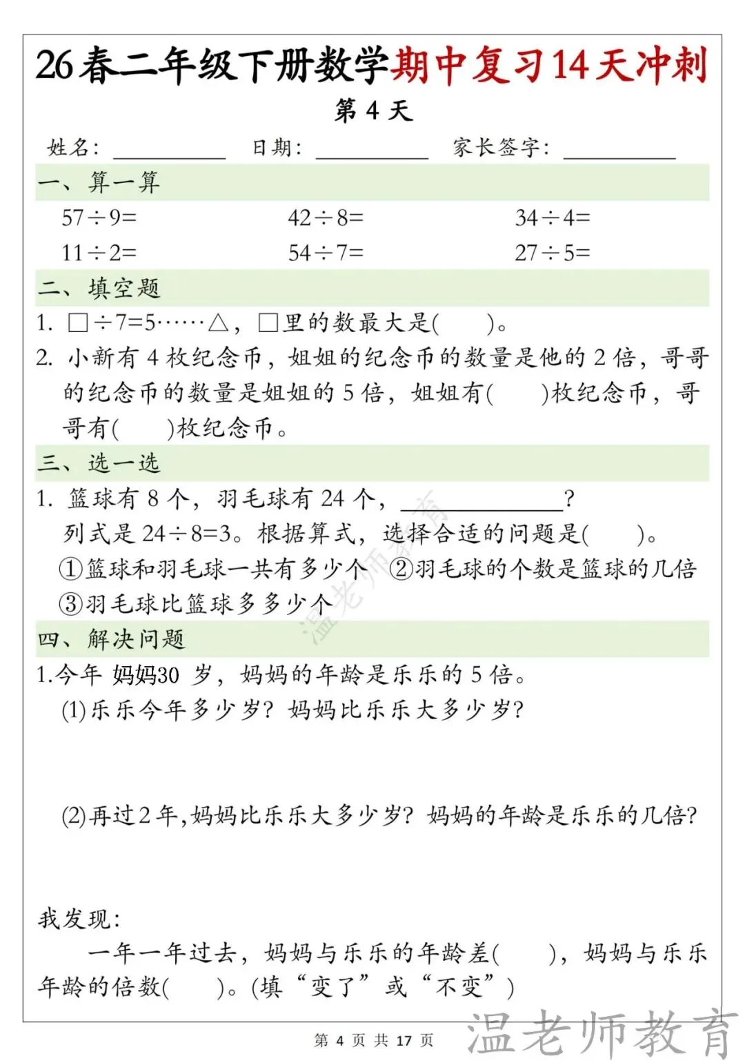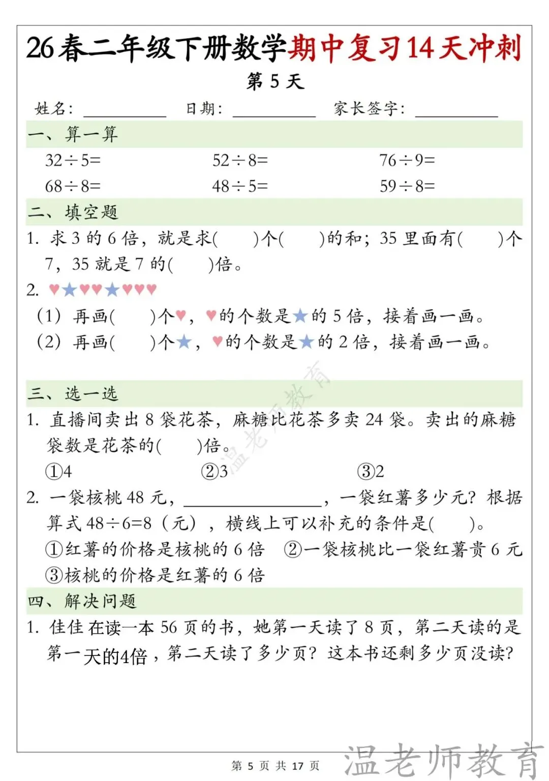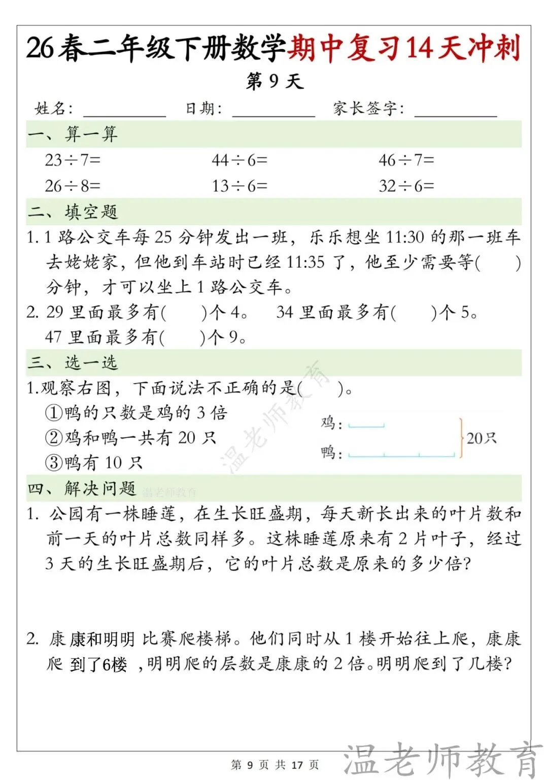 今天分享的是:二年级下册数学期中复习14天冲刺计划。这套资料包含了口算题、填空题、应用题等基础题型,每天一页,可以帮助孩子提高计算速度和准确度,是非常不错的复习材料!