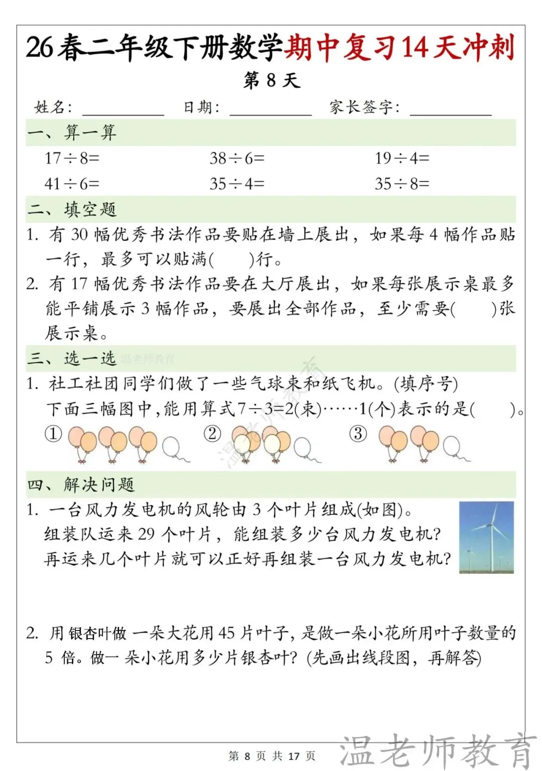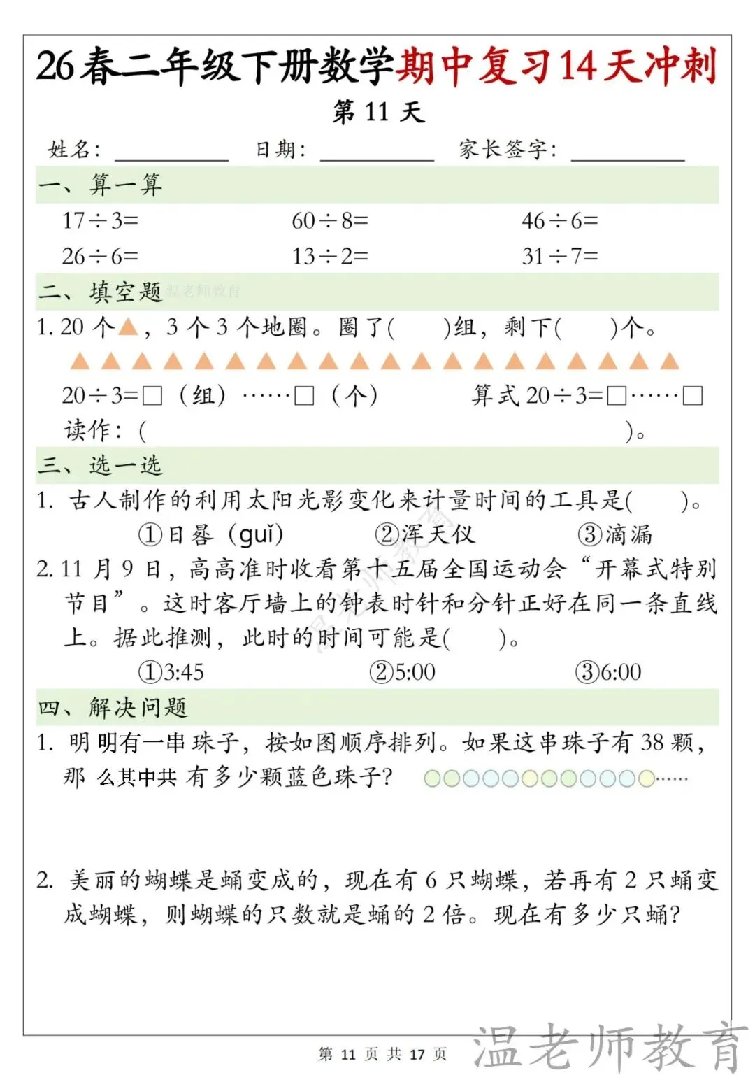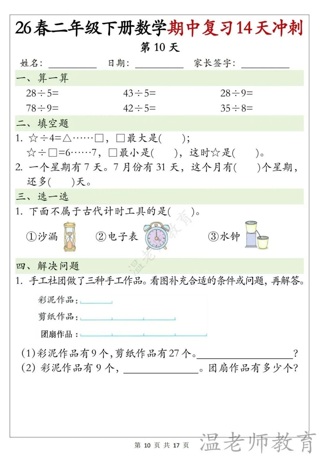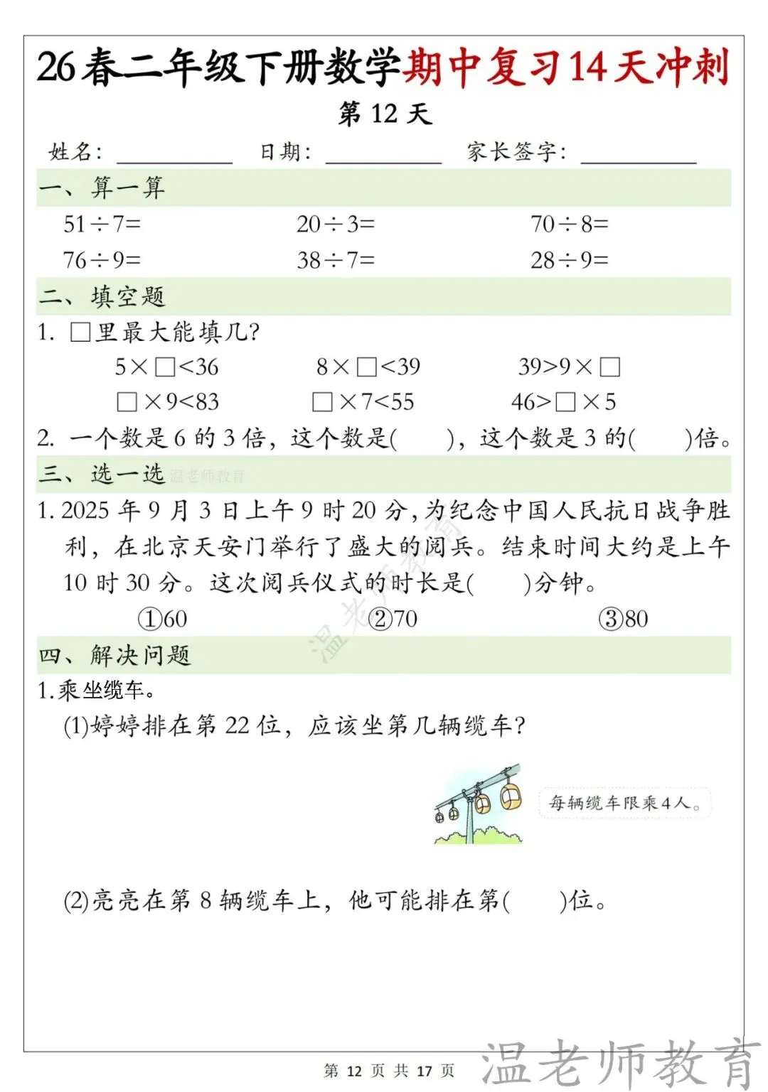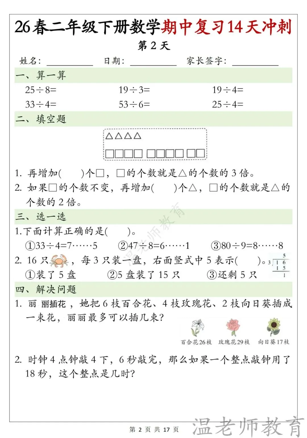 26春二年级下册数学期中复习14天冲刺,电子版可打印