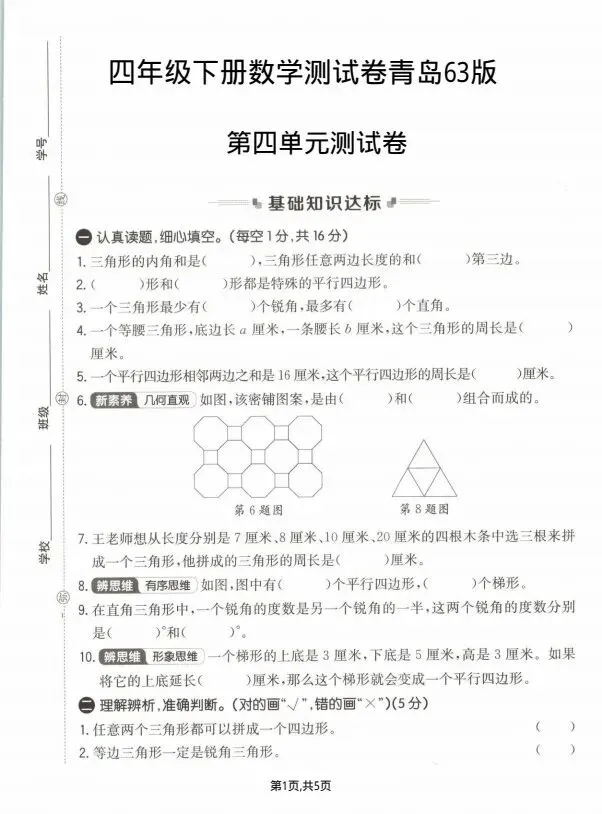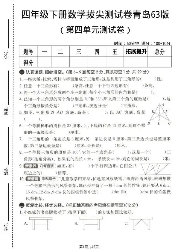 今日分享四年级下册数学青岛63版第四单元拔尖测试卷2套含答案(完整电子版可打印)!高清电子版可直接打印,排版规整适配练习,不用费心整理,孩子每日一练夯实基础,家长辅导省心!