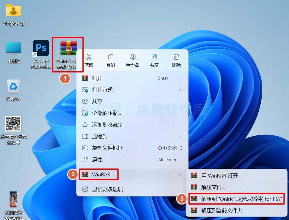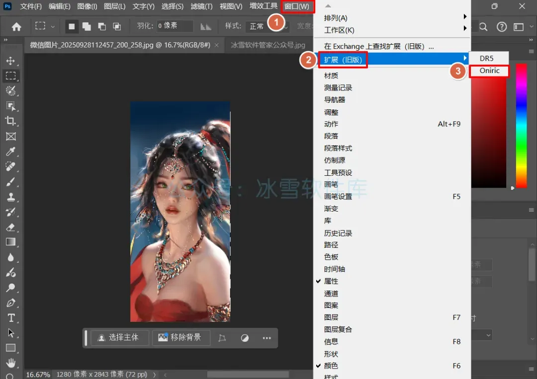 8.安装成功:在PS菜单栏①点击【窗口】②点击【拓展(旧版)③点击【Oniric】。