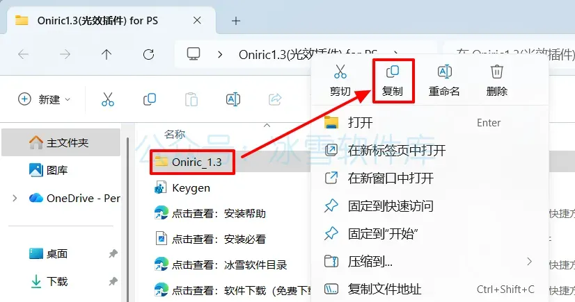 2.打开解压后的文件夹,鼠标右击【Oniric1.3】选择【复制】。