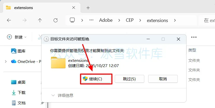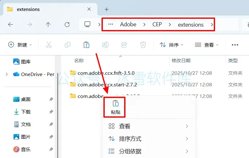 3.打开C盘路径【C:\Program Files (x86)\Common Files\Adobe\CEP\extensions\】(若没有这个路径,请手动创建),鼠标右击空白处选择【粘贴】。
