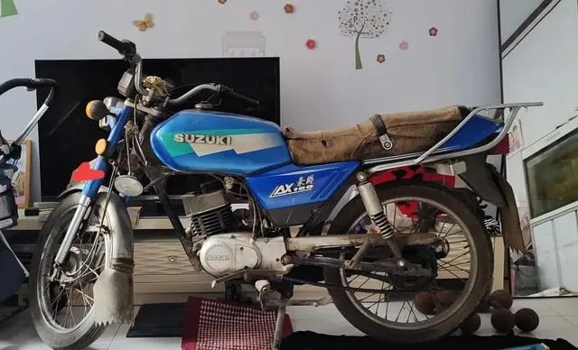 这蓝色摩托叫铃木AX100,八十年代热得很,发动机有进口有国产,进口一台能顶三辆大三轮,老爸讲过,一脚点火,油门一轰能看出一股蓝烟,声音清脆脆的,邻居家小孩骑一圈回来脸都晒红了,豪爵也做过这个型号,后头出了好几代,谁都说进口的发动机更有劲,国产的皮实但真有差别,骑惯了都明白那点门道。