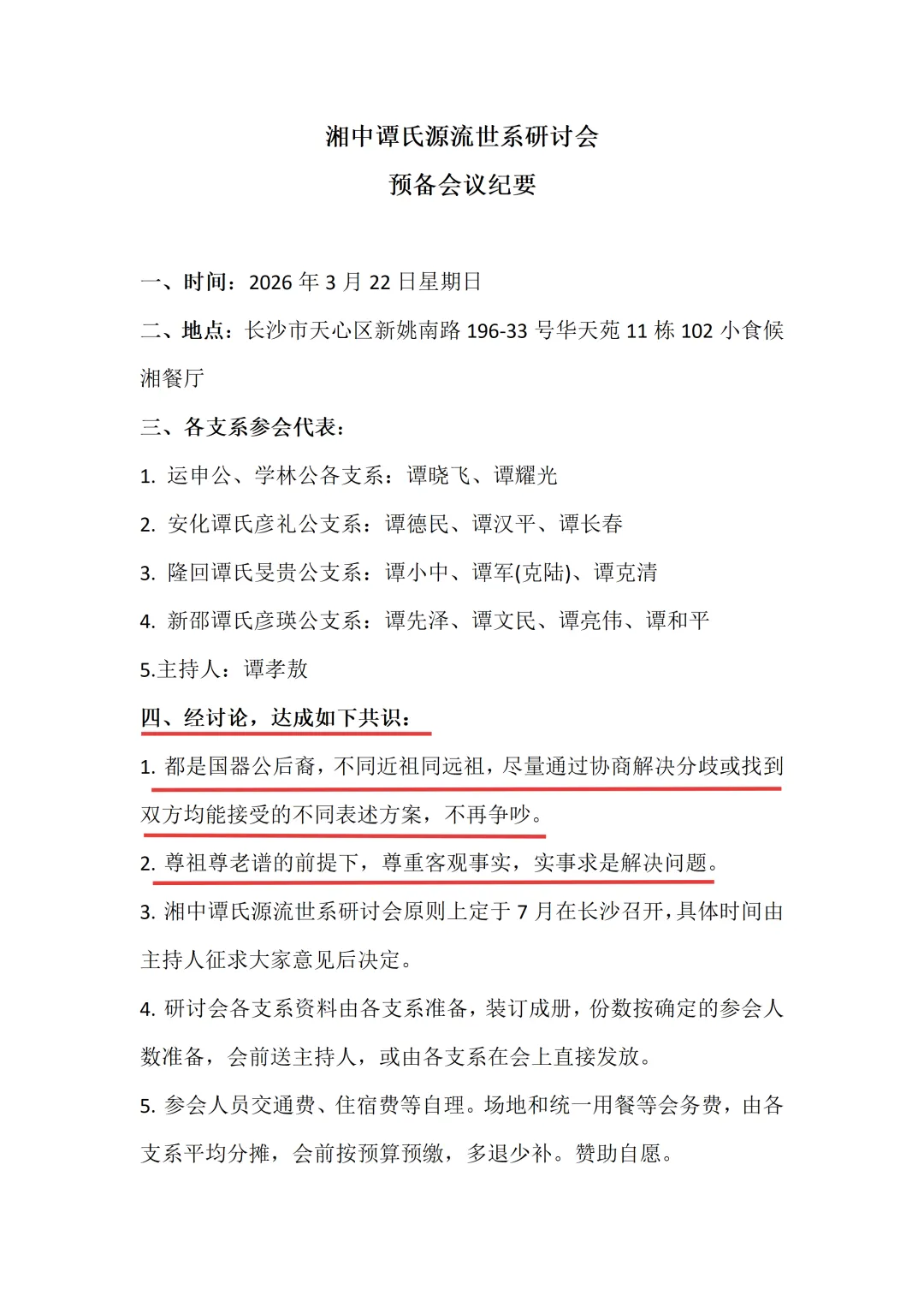 2025年12月,谭耀光来长沙时,约我和其他宗亲在涟源新任会长谭晓飞办公室见面,共同聊到争议问题和被隆回骂,谭晓飞提出开个会协调一下,不要争了,影响形象,我认为很好,以为他们想解决问题,于是决定召开“湘中谭氏源流世系研讨会”,发了通知,组织了研讨群。因我是安化谭氏彦圣房的,不是与涟源有直接争议的安化谭氏彦礼房后裔,我作为主持人。