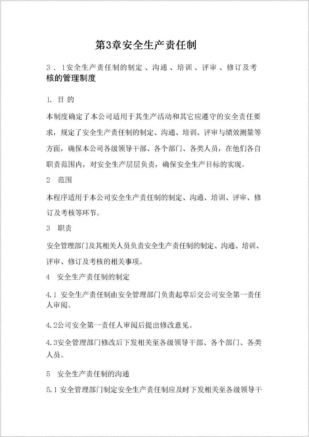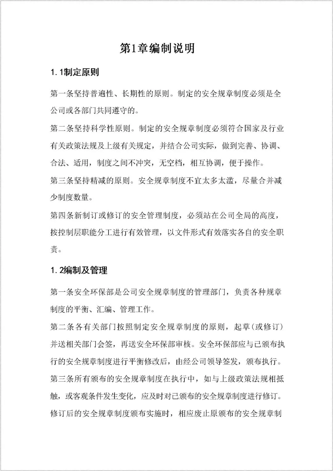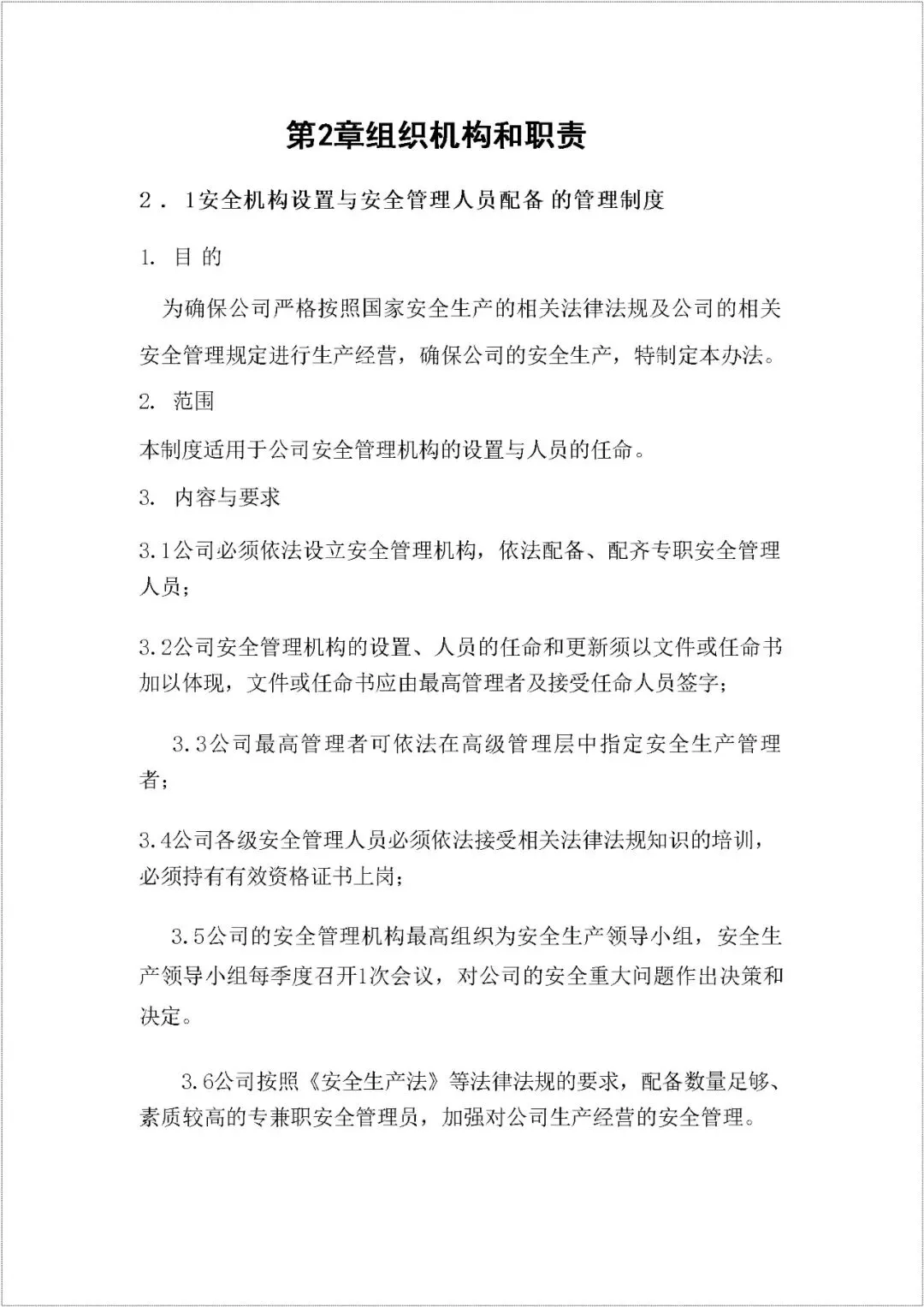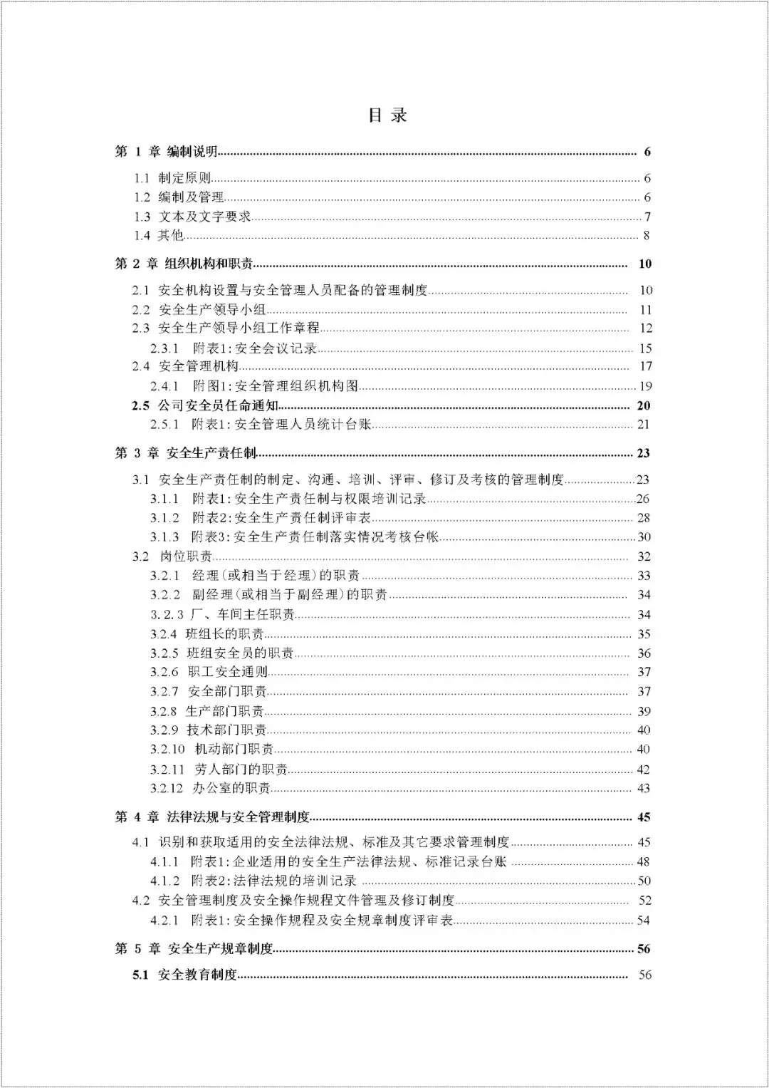 第 1 章 编制说明 61.1 制定原则 61.2 编制及管理 61.3 文本及文字要求 71.4 其他 8第 2 章 组织机构和职责 102.1 安全机构设置与安全管理人员配备的管理制度 102.2 安全生产领导小组 112.3 安全生产领导小组工作章程 122.3.1 附表1:安全会议记录 152.4 安全管理机构 172.4.1 附图1:安全管理组织机构图 192.5 公司安全员任命通知 202.5.1 附表1:安全管理人员统计台账 21第 3 章 安全生产责任制 233.1 安全生产责任制的制定、沟通、培训、评审、修订及考核的管理制度 233.1.1 附表1:安全生产责任制与权限培训记录 263.1.2 附表2:安全生产责任制评审表 283.1.3 附表3:安全生产责任制落实情况考核台帐 303.2 岗位职责 323.2.1 经理(或相当于经理)的职责 333.2.2 副经理(或相当于副经理)的职责 343.2.3 厂、车间主任职责 343.2.4 班组长的职责 353.2.5 班组安全员的职责 363.2.6 职工安全通则 373.2.7 安全部门职责 373.2.8 生产部门职责 393.2.9 技术部门职责 403.2.10 机动部门职责 403.2.11 劳人部门的职责 423.2.12 办公室的职责 43第 4 章 法律法规与安全管理制度 454.1 识别和获取适用的安全法律法规、标准及其它要求管理制度 454.1.1 附表1:企业适用的安全生产法律法规、标准记录台账 484.1.2 附表2:法律法规的培训记录 504.2 安全管理制度及安全操作规程文件管理及修订制度 524.2.1 附表1:安全操作规程及安全规章制度评审表 54第 5 章 安全生产规章制度 565.1 安全教育制度 56