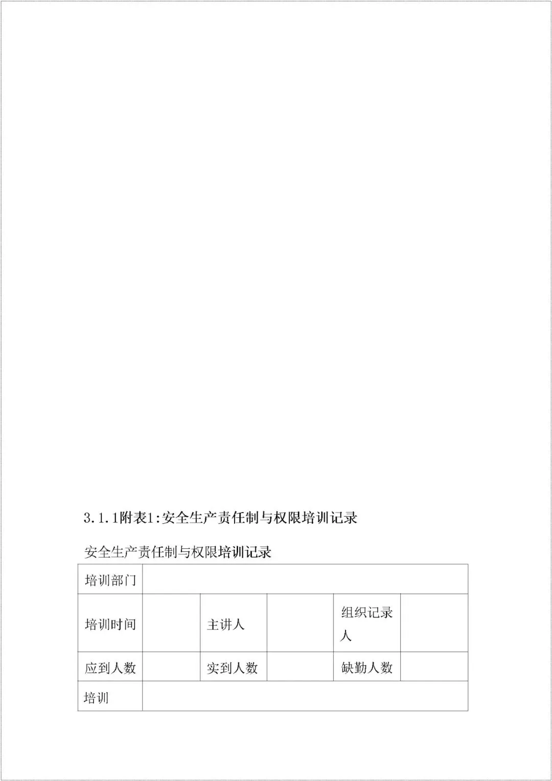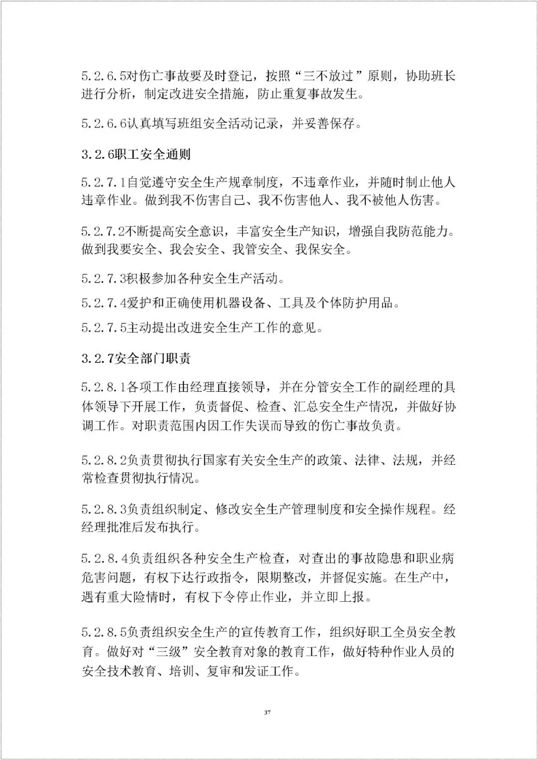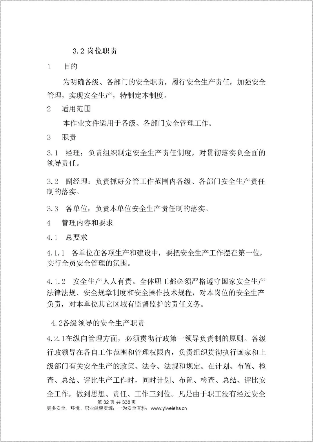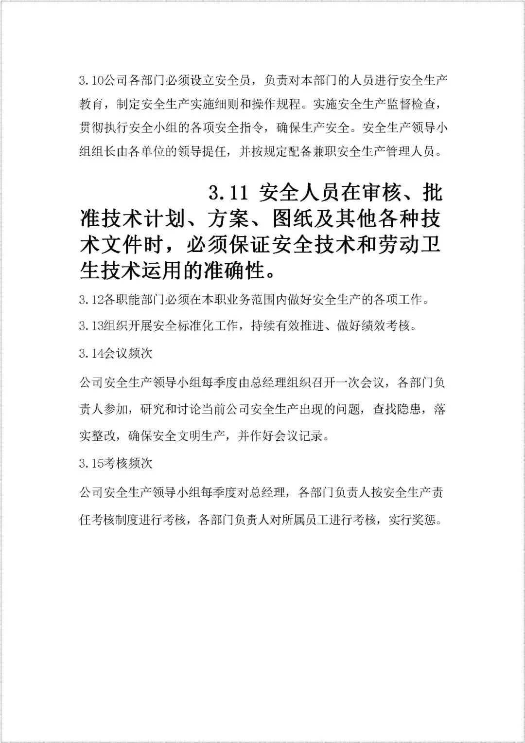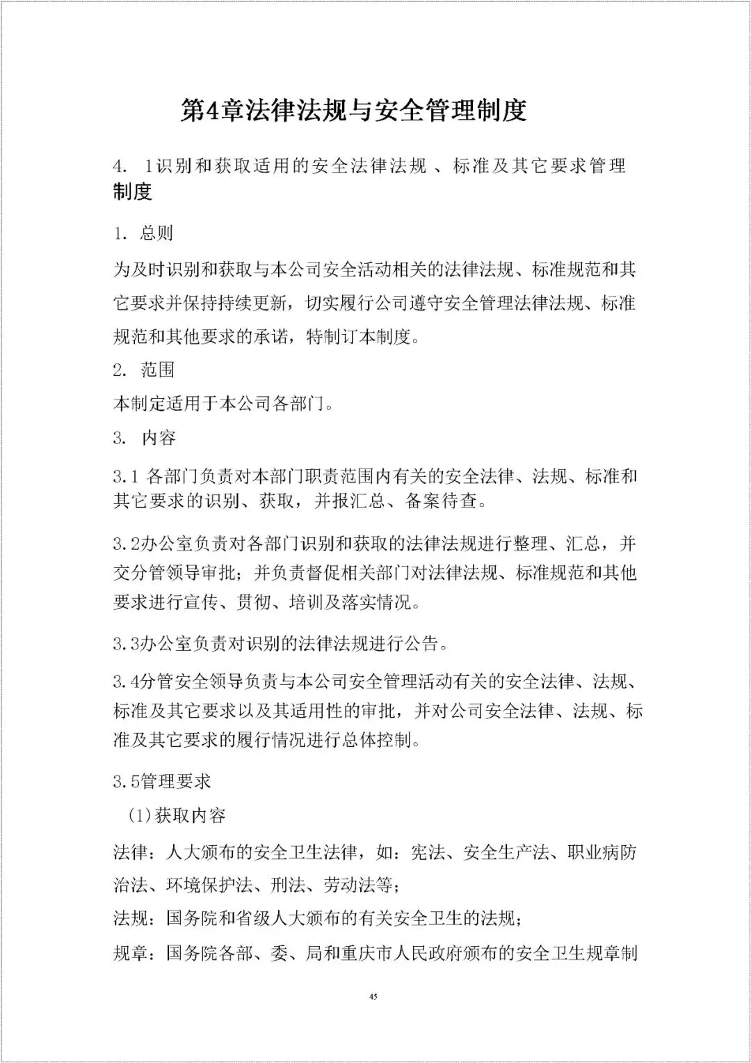 第 1 章 编制说明 61.1 制定原则 61.2 编制及管理 61.3 文本及文字要求 71.4 其他 8第 2 章 组织机构和职责 102.1 安全机构设置与安全管理人员配备的管理制度 102.2 安全生产领导小组 112.3 安全生产领导小组工作章程 122.3.1 附表1:安全会议记录 152.4 安全管理机构 172.4.1 附图1:安全管理组织机构图 192.5 公司安全员任命通知 202.5.1 附表1:安全管理人员统计台账 21第 3 章 安全生产责任制 233.1 安全生产责任制的制定、沟通、培训、评审、修订及考核的管理制度 233.1.1 附表1:安全生产责任制与权限培训记录 263.1.2 附表2:安全生产责任制评审表 283.1.3 附表3:安全生产责任制落实情况考核台帐 303.2 岗位职责 323.2.1 经理(或相当于经理)的职责 333.2.2 副经理(或相当于副经理)的职责 343.2.3 厂、车间主任职责 343.2.4 班组长的职责 353.2.5 班组安全员的职责 363.2.6 职工安全通则 373.2.7 安全部门职责 373.2.8 生产部门职责 393.2.9 技术部门职责 403.2.10 机动部门职责 403.2.11 劳人部门的职责 423.2.12 办公室的职责 43第 4 章 法律法规与安全管理制度 454.1 识别和获取适用的安全法律法规、标准及其它要求管理制度 454.1.1 附表1:企业适用的安全生产法律法规、标准记录台账 484.1.2 附表2:法律法规的培训记录 504.2 安全管理制度及安全操作规程文件管理及修订制度 524.2.1 附表1:安全操作规程及安全规章制度评审表 54第 5 章 安全生产规章制度 565.1 安全教育制度 56