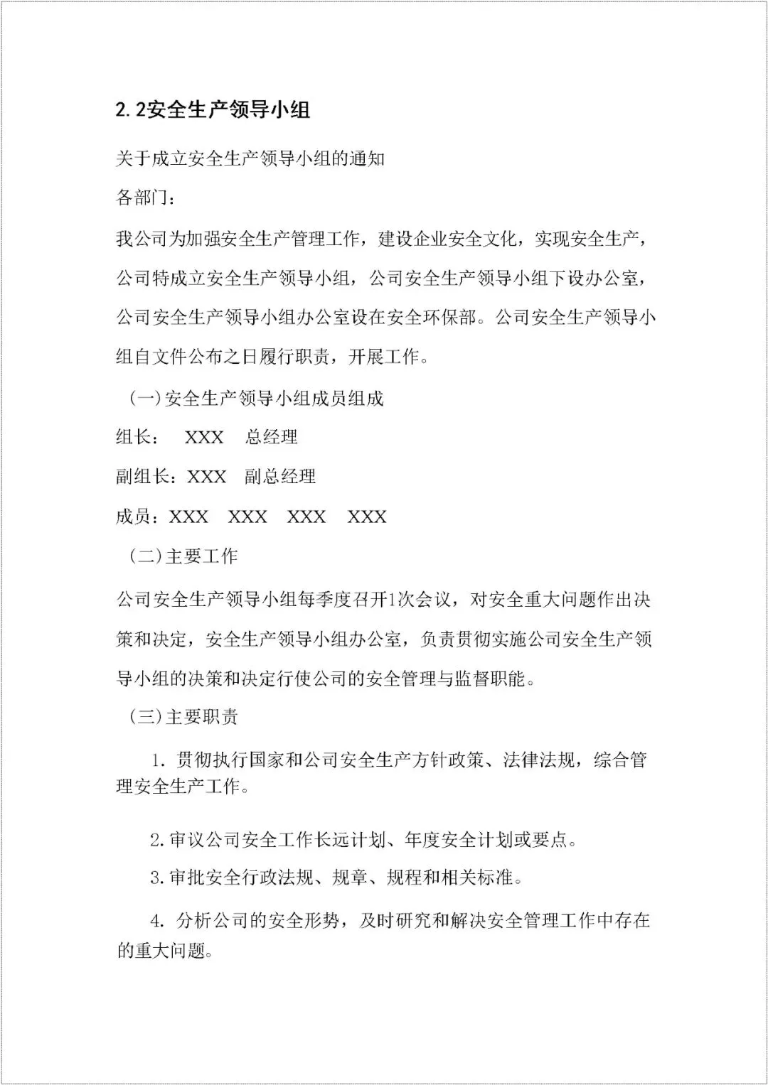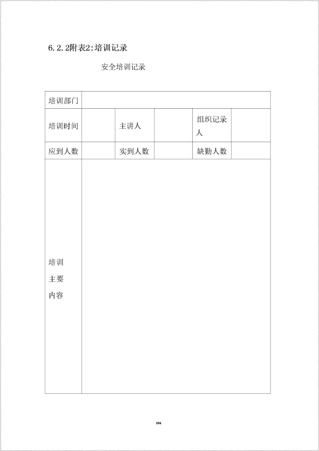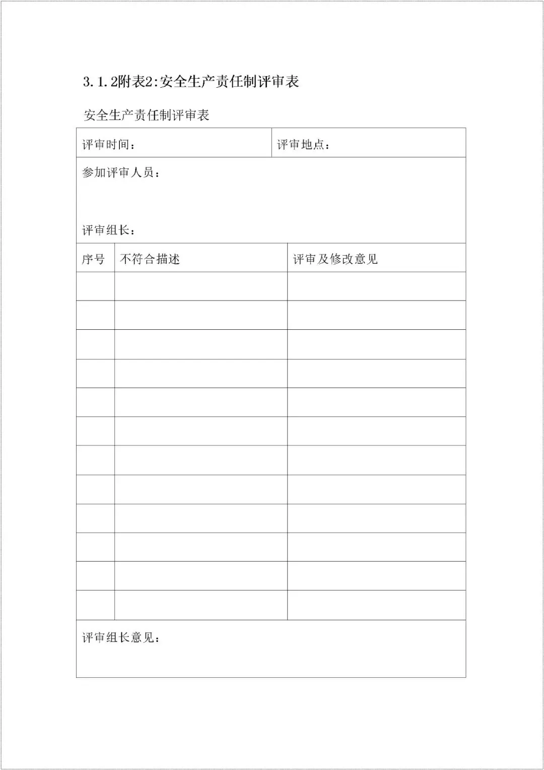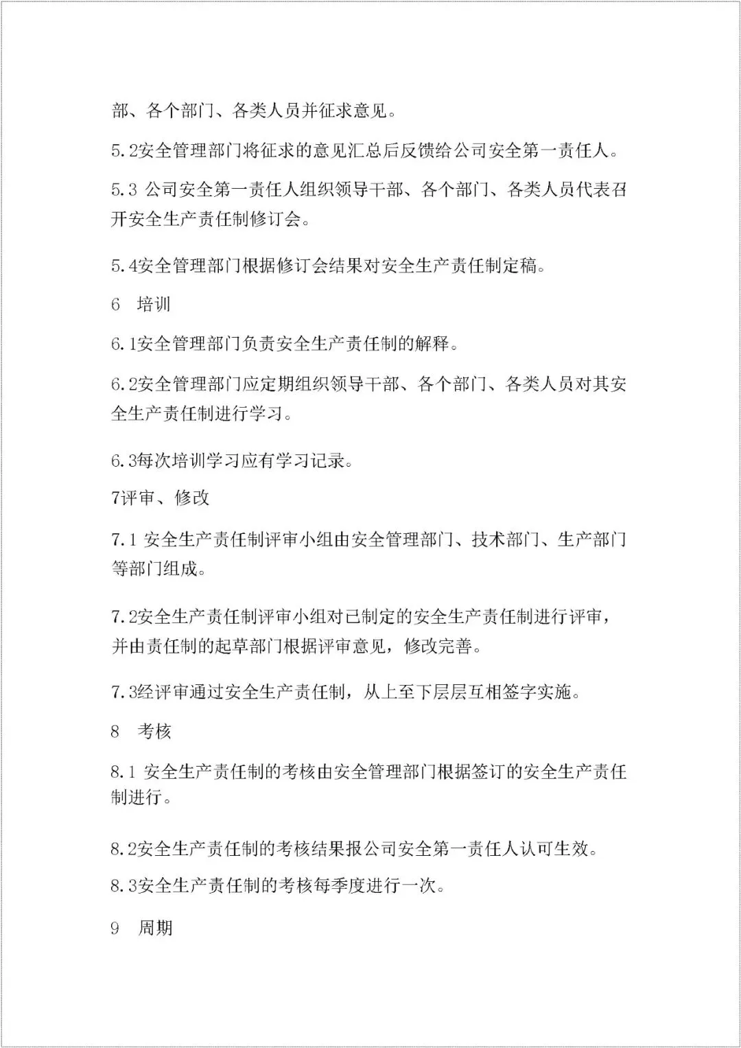 第 1 章 编制说明 61.1 制定原则 61.2 编制及管理 61.3 文本及文字要求 71.4 其他 8第 2 章 组织机构和职责 102.1 安全机构设置与安全管理人员配备的管理制度 102.2 安全生产领导小组 112.3 安全生产领导小组工作章程 122.3.1 附表1:安全会议记录 152.4 安全管理机构 172.4.1 附图1:安全管理组织机构图 192.5 公司安全员任命通知 202.5.1 附表1:安全管理人员统计台账 21第 3 章 安全生产责任制 233.1 安全生产责任制的制定、沟通、培训、评审、修订及考核的管理制度 233.1.1 附表1:安全生产责任制与权限培训记录 263.1.2 附表2:安全生产责任制评审表 283.1.3 附表3:安全生产责任制落实情况考核台帐 303.2 岗位职责 323.2.1 经理(或相当于经理)的职责 333.2.2 副经理(或相当于副经理)的职责 343.2.3 厂、车间主任职责 343.2.4 班组长的职责 353.2.5 班组安全员的职责 363.2.6 职工安全通则 373.2.7 安全部门职责 373.2.8 生产部门职责 393.2.9 技术部门职责 403.2.10 机动部门职责 403.2.11 劳人部门的职责 423.2.12 办公室的职责 43第 4 章 法律法规与安全管理制度 454.1 识别和获取适用的安全法律法规、标准及其它要求管理制度 454.1.1 附表1:企业适用的安全生产法律法规、标准记录台账 484.1.2 附表2:法律法规的培训记录 504.2 安全管理制度及安全操作规程文件管理及修订制度 524.2.1 附表1:安全操作规程及安全规章制度评审表 54第 5 章 安全生产规章制度 565.1 安全教育制度 56