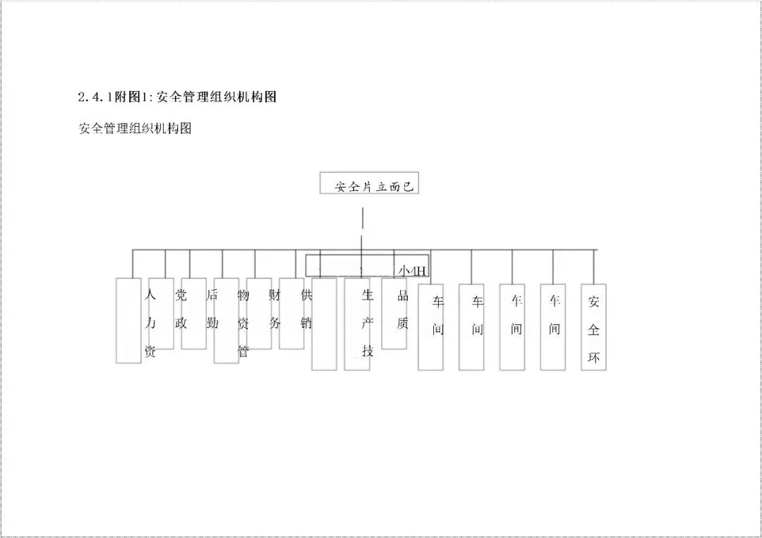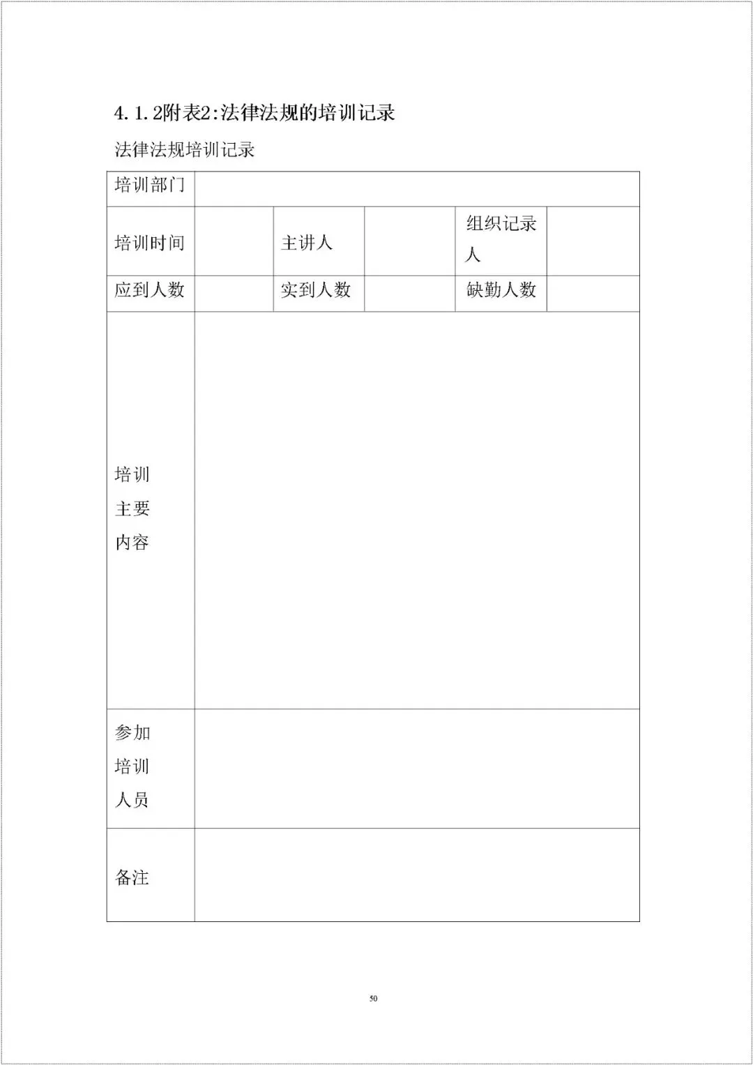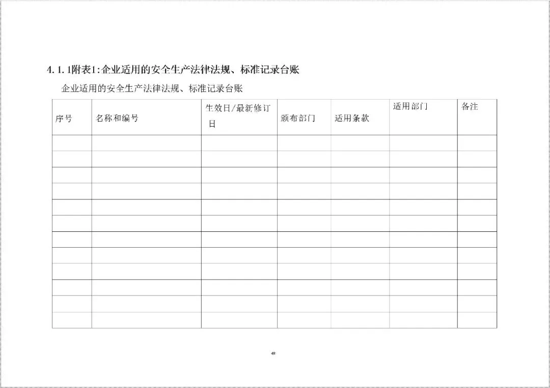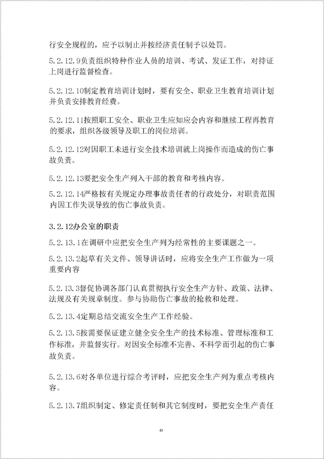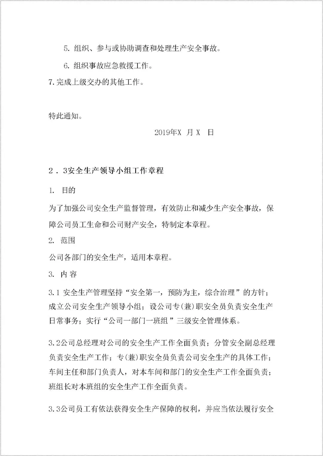 第 1 章 编制说明 61.1 制定原则 61.2 编制及管理 61.3 文本及文字要求 71.4 其他 8第 2 章 组织机构和职责 102.1 安全机构设置与安全管理人员配备的管理制度 102.2 安全生产领导小组 112.3 安全生产领导小组工作章程 122.3.1 附表1:安全会议记录 152.4 安全管理机构 172.4.1 附图1:安全管理组织机构图 192.5 公司安全员任命通知 202.5.1 附表1:安全管理人员统计台账 21第 3 章 安全生产责任制 233.1 安全生产责任制的制定、沟通、培训、评审、修订及考核的管理制度 233.1.1 附表1:安全生产责任制与权限培训记录 263.1.2 附表2:安全生产责任制评审表 283.1.3 附表3:安全生产责任制落实情况考核台帐 303.2 岗位职责 323.2.1 经理(或相当于经理)的职责 333.2.2 副经理(或相当于副经理)的职责 343.2.3 厂、车间主任职责 343.2.4 班组长的职责 353.2.5 班组安全员的职责 363.2.6 职工安全通则 373.2.7 安全部门职责 373.2.8 生产部门职责 393.2.9 技术部门职责 403.2.10 机动部门职责 403.2.11 劳人部门的职责 423.2.12 办公室的职责 43第 4 章 法律法规与安全管理制度 454.1 识别和获取适用的安全法律法规、标准及其它要求管理制度 454.1.1 附表1:企业适用的安全生产法律法规、标准记录台账 484.1.2 附表2:法律法规的培训记录 504.2 安全管理制度及安全操作规程文件管理及修订制度 524.2.1 附表1:安全操作规程及安全规章制度评审表 54第 5 章 安全生产规章制度 565.1 安全教育制度 56