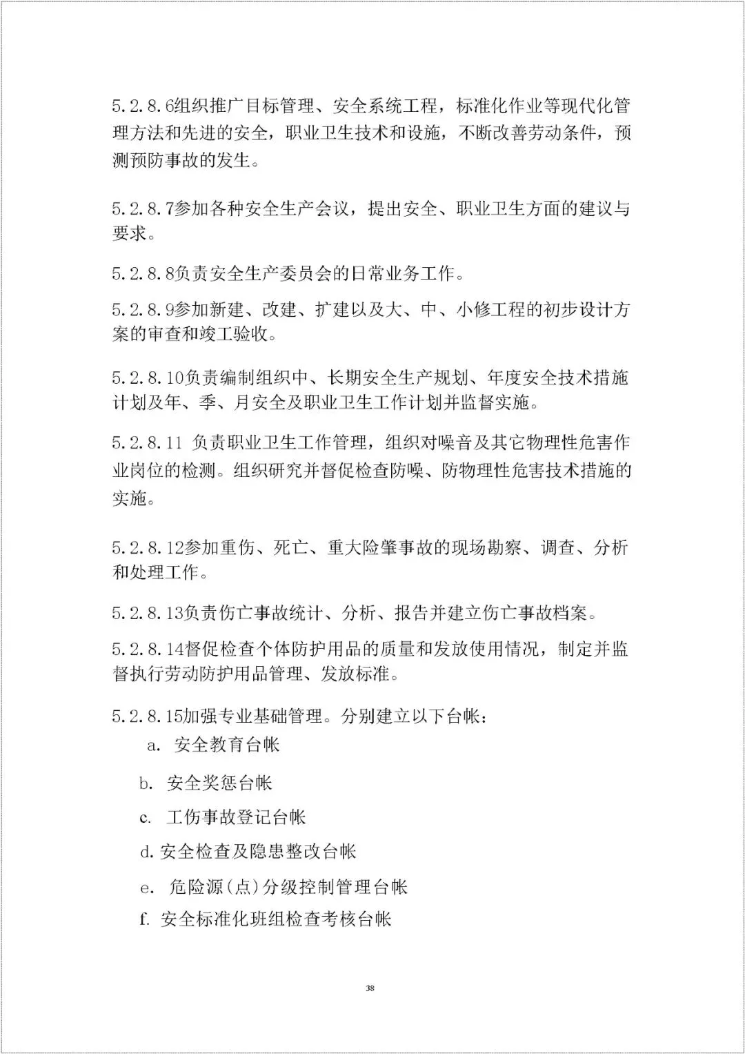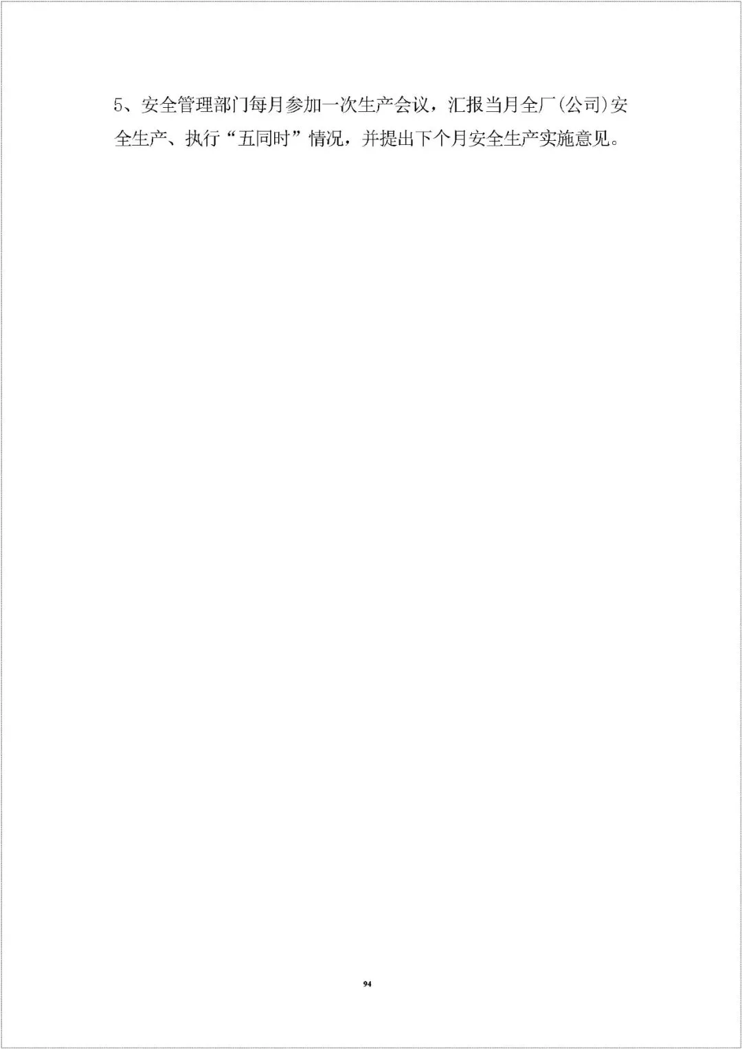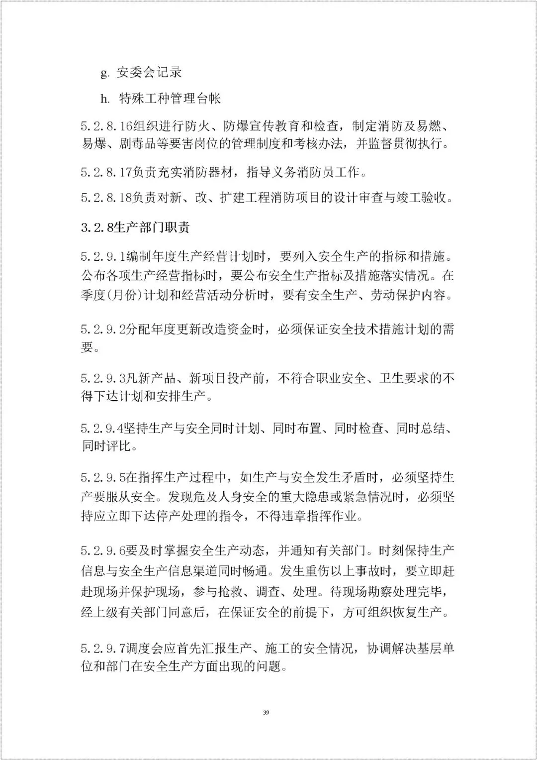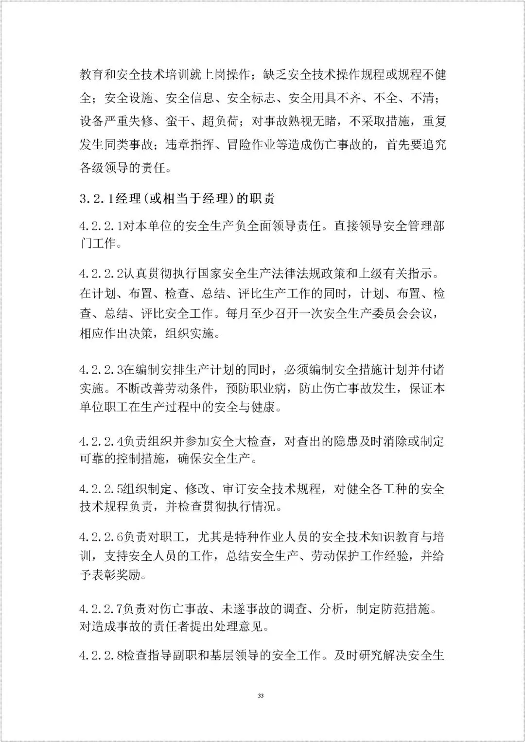 第 1 章 编制说明 61.1 制定原则 61.2 编制及管理 61.3 文本及文字要求 71.4 其他 8第 2 章 组织机构和职责 102.1 安全机构设置与安全管理人员配备的管理制度 102.2 安全生产领导小组 112.3 安全生产领导小组工作章程 122.3.1 附表1:安全会议记录 152.4 安全管理机构 172.4.1 附图1:安全管理组织机构图 192.5 公司安全员任命通知 202.5.1 附表1:安全管理人员统计台账 21第 3 章 安全生产责任制 233.1 安全生产责任制的制定、沟通、培训、评审、修订及考核的管理制度 233.1.1 附表1:安全生产责任制与权限培训记录 263.1.2 附表2:安全生产责任制评审表 283.1.3 附表3:安全生产责任制落实情况考核台帐 303.2 岗位职责 323.2.1 经理(或相当于经理)的职责 333.2.2 副经理(或相当于副经理)的职责 343.2.3 厂、车间主任职责 343.2.4 班组长的职责 353.2.5 班组安全员的职责 363.2.6 职工安全通则 373.2.7 安全部门职责 373.2.8 生产部门职责 393.2.9 技术部门职责 403.2.10 机动部门职责 403.2.11 劳人部门的职责 423.2.12 办公室的职责 43第 4 章 法律法规与安全管理制度 454.1 识别和获取适用的安全法律法规、标准及其它要求管理制度 454.1.1 附表1:企业适用的安全生产法律法规、标准记录台账 484.1.2 附表2:法律法规的培训记录 504.2 安全管理制度及安全操作规程文件管理及修订制度 524.2.1 附表1:安全操作规程及安全规章制度评审表 54第 5 章 安全生产规章制度 565.1 安全教育制度 56