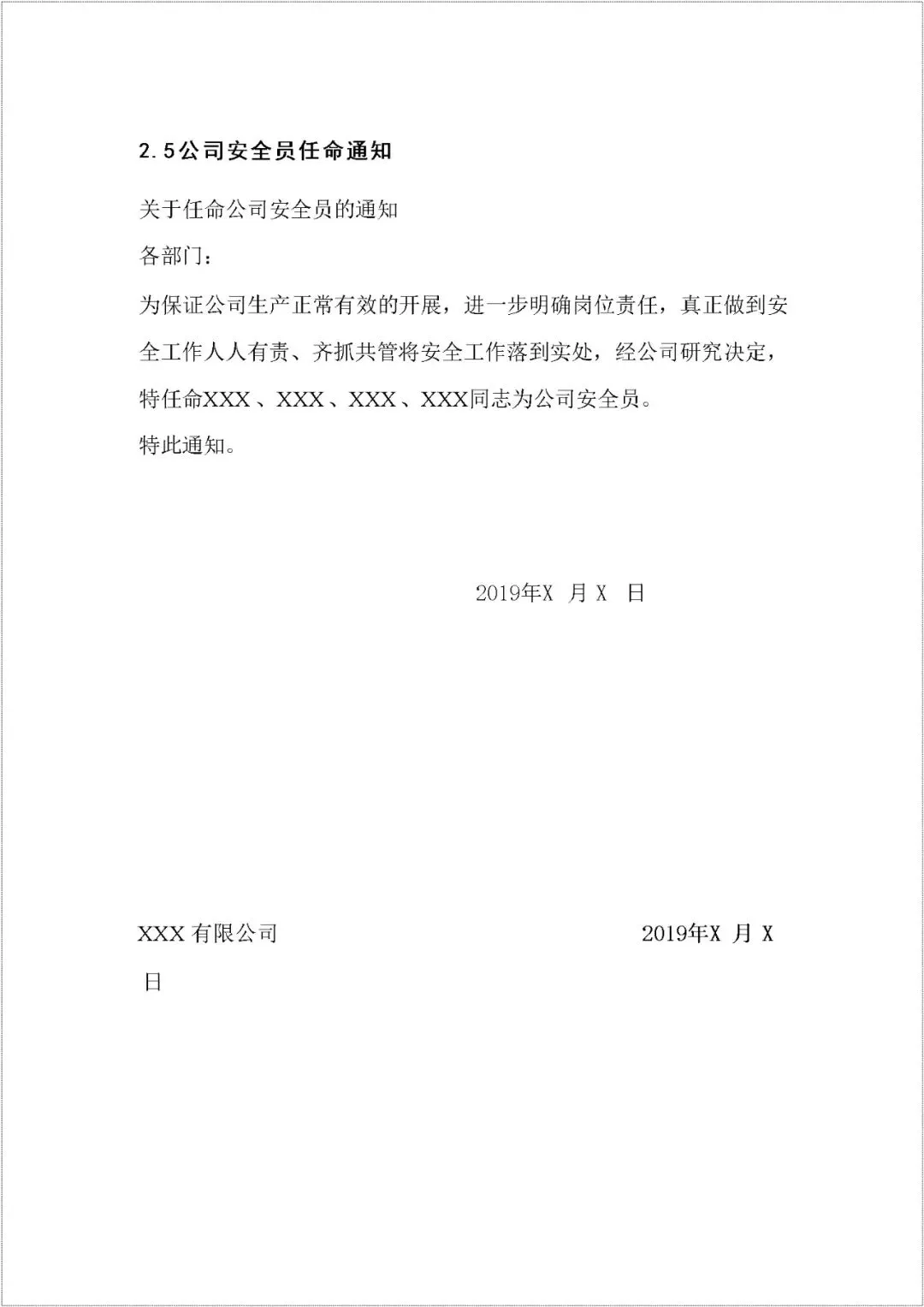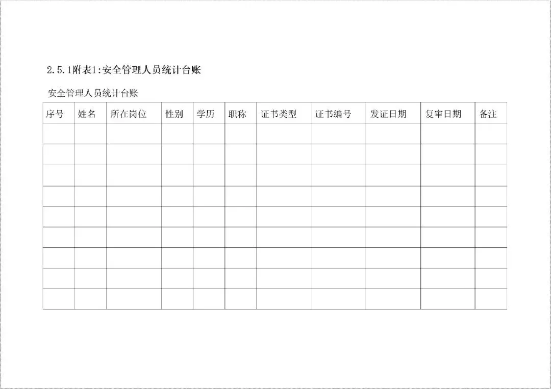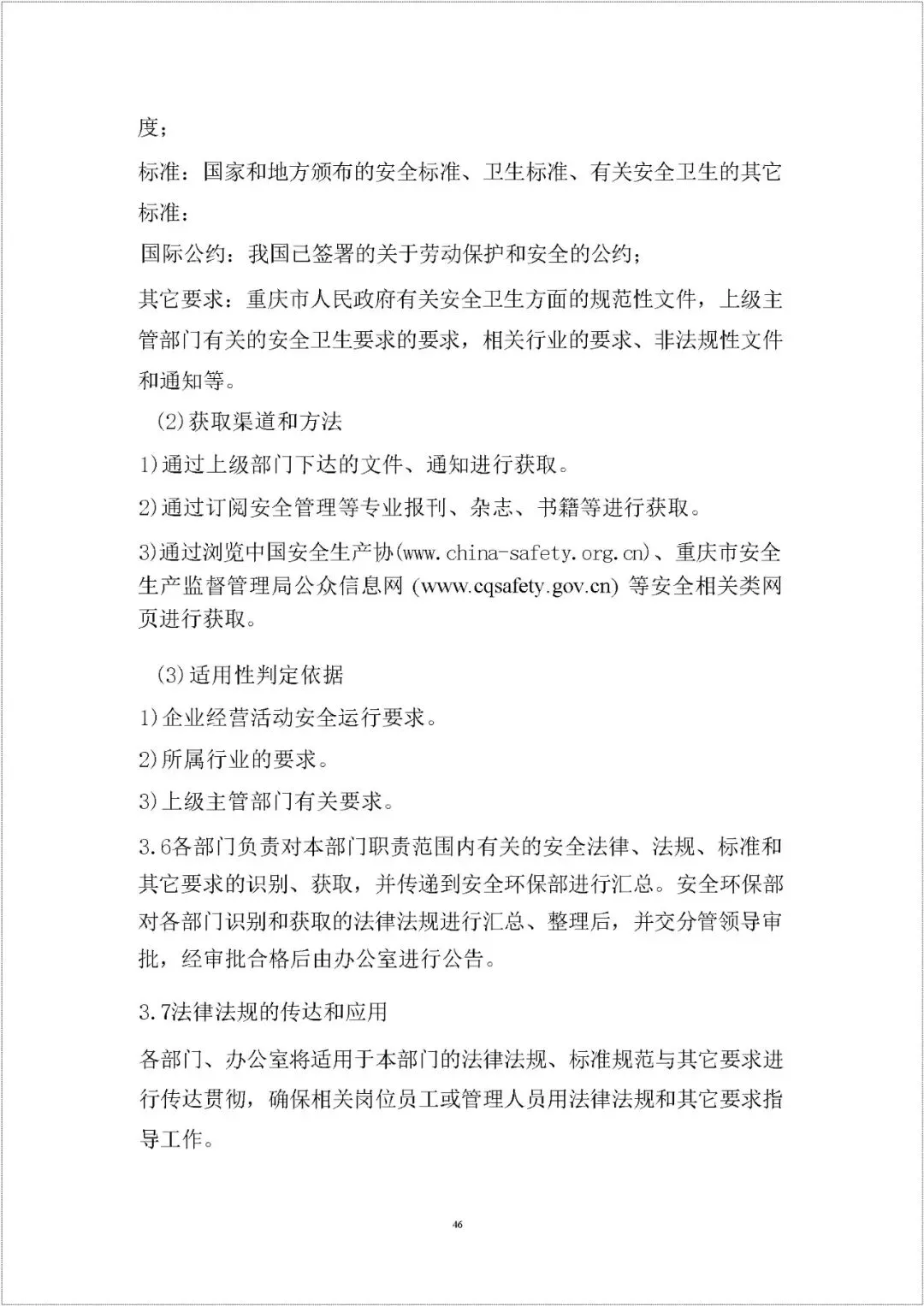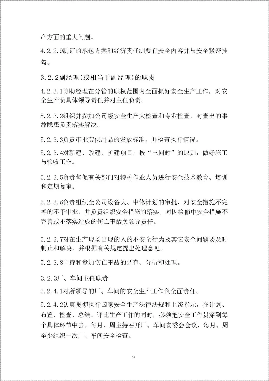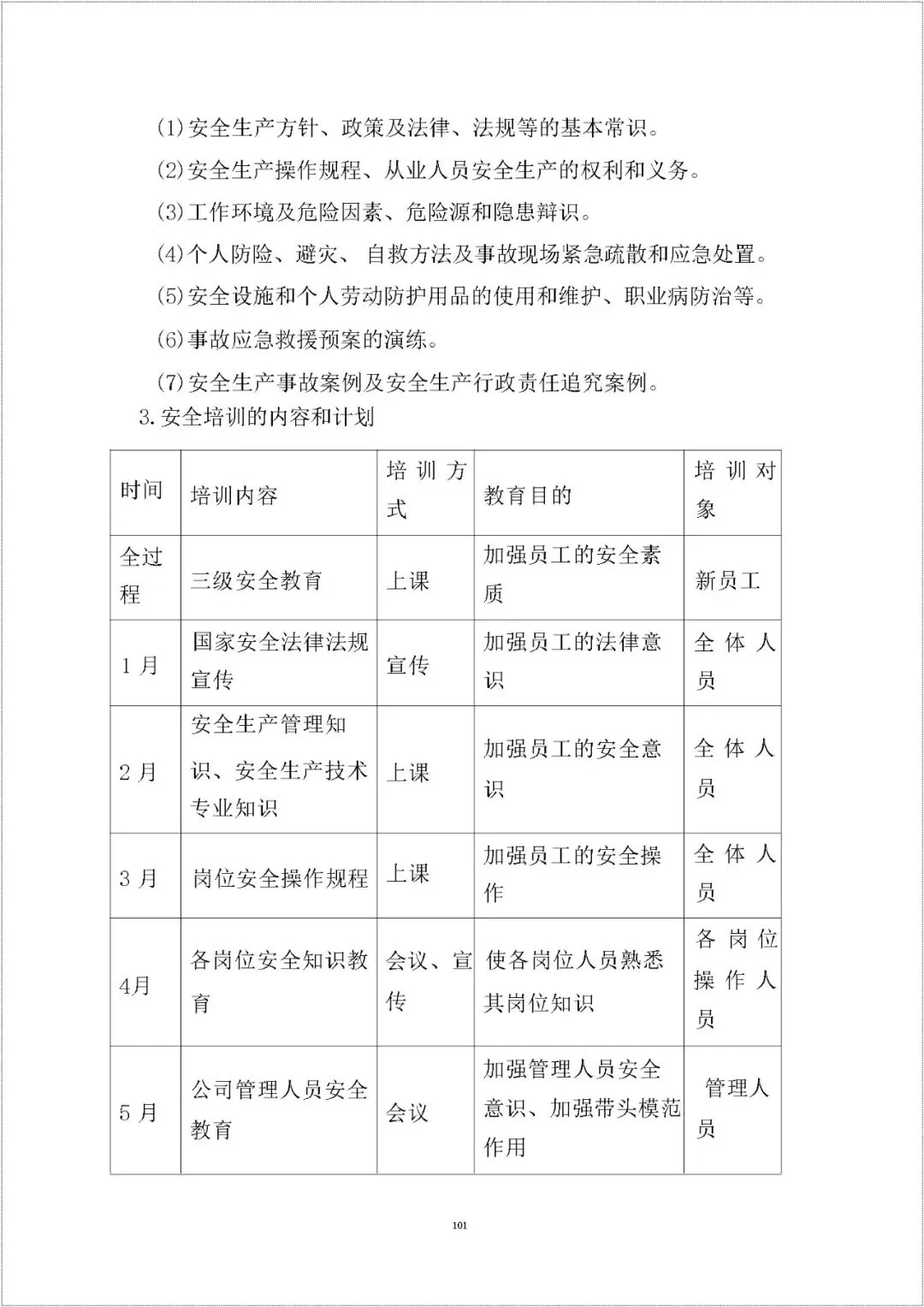 第 1 章 编制说明 61.1 制定原则 61.2 编制及管理 61.3 文本及文字要求 71.4 其他 8第 2 章 组织机构和职责 102.1 安全机构设置与安全管理人员配备的管理制度 102.2 安全生产领导小组 112.3 安全生产领导小组工作章程 122.3.1 附表1:安全会议记录 152.4 安全管理机构 172.4.1 附图1:安全管理组织机构图 192.5 公司安全员任命通知 202.5.1 附表1:安全管理人员统计台账 21第 3 章 安全生产责任制 233.1 安全生产责任制的制定、沟通、培训、评审、修订及考核的管理制度 233.1.1 附表1:安全生产责任制与权限培训记录 263.1.2 附表2:安全生产责任制评审表 283.1.3 附表3:安全生产责任制落实情况考核台帐 303.2 岗位职责 323.2.1 经理(或相当于经理)的职责 333.2.2 副经理(或相当于副经理)的职责 343.2.3 厂、车间主任职责 343.2.4 班组长的职责 353.2.5 班组安全员的职责 363.2.6 职工安全通则 373.2.7 安全部门职责 373.2.8 生产部门职责 393.2.9 技术部门职责 403.2.10 机动部门职责 403.2.11 劳人部门的职责 423.2.12 办公室的职责 43第 4 章 法律法规与安全管理制度 454.1 识别和获取适用的安全法律法规、标准及其它要求管理制度 454.1.1 附表1:企业适用的安全生产法律法规、标准记录台账 484.1.2 附表2:法律法规的培训记录 504.2 安全管理制度及安全操作规程文件管理及修订制度 524.2.1 附表1:安全操作规程及安全规章制度评审表 54第 5 章 安全生产规章制度 565.1 安全教育制度 56
