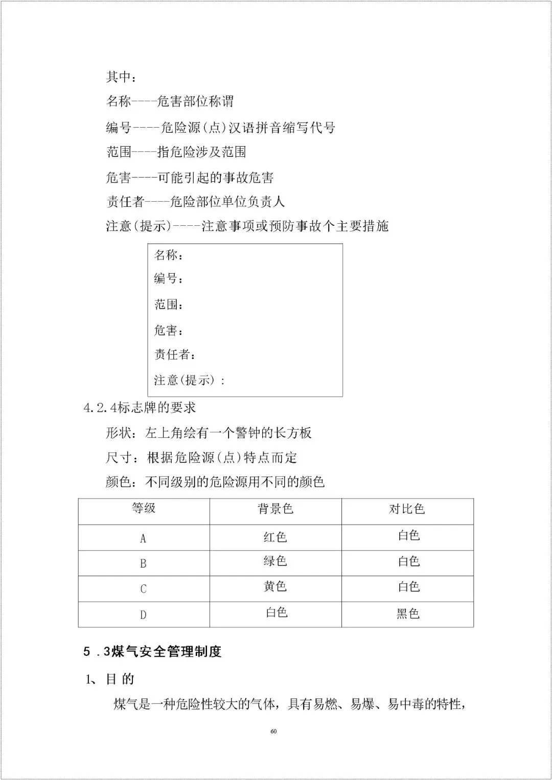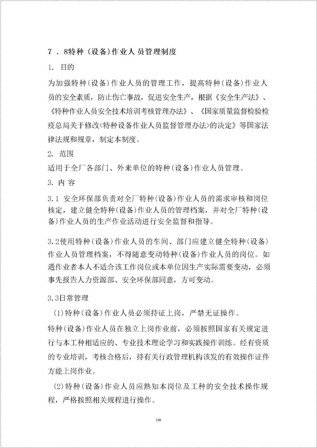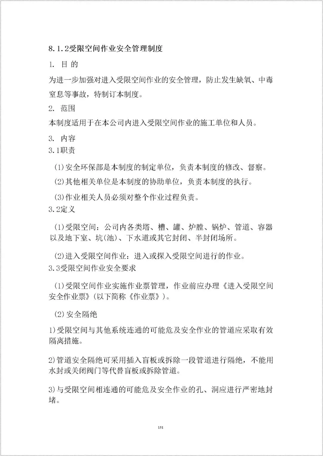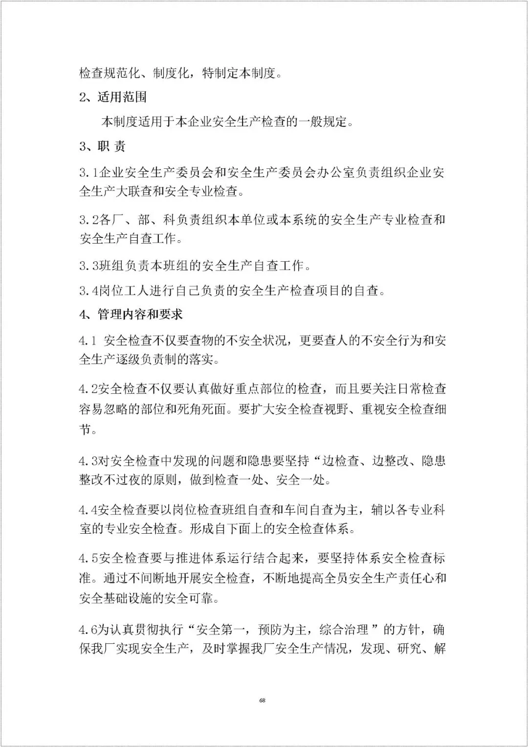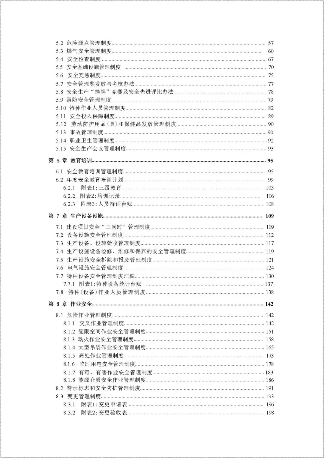 5.2 危险源点管理制度 575.3 煤气安全管理制度 605.4 安全检查制度 675.5 安全基础设施管理制度 705.6 安全奖惩制度 755.7 安全管理奖发放与考核办法 775.8 安全生产“挂牌”竞赛及安全先进评比办法 785.9 消防安全管理制度 795.10 特种作业人员管理制度 825.11 安全投入保障制度 895.12 劳动防护用品(具)和保健品发放管理制度 905.13 事故管理制度 905.14 职业卫生管理制度 925.15 安全生产会议管理制度 93第 6 章 教育培训 956.1 安全教育培训管理制度 956.2 年度安全教育培训计划 996.2.1 附表1:三级教育 1036.2.2 附表2:培训记录 1066.2.3 附表3:人员持证台账 108第 7 章 生产设备设施 1097.1 建设项目安全“三同时”管理制度 1097.2 设备设施安全管理制度 1127.3 生产设备、设施验收管理制度 1177.4 生产设施设备检修、维修和保养的安全管理制度 1197.5 生产设施安全拆除和报废管理制度 1217.6 电气设施安全管理制度 1247.7 特种设备安全管理制度汇编 1307.7.1 附表1:特种设备统计台账 1377.8 特种(设备)作业人员管理制度 138第 8 章 作业安全 1428.1 危险作业管理制度 1428.1.1 交叉作业管理制度 1428.1.2 受限空间作业安全管理制度 1518.1.3 动火作业安全管理制度 1588.1.4 大型吊装作业安全管理制度 1658.1.5 高处作业管理制度 1738.1.6 临时用电安全管理制度 1788.1.7 有毒、有害作业安全管理制度 1838.1.8 能源介质安全作业管理制度 1868.2 警示标志和安全防护管理制度 1918.3 变更管理制度 1938.3.1 附表1:变更申请表 1968.3.2 附表2:变更验收表 198
