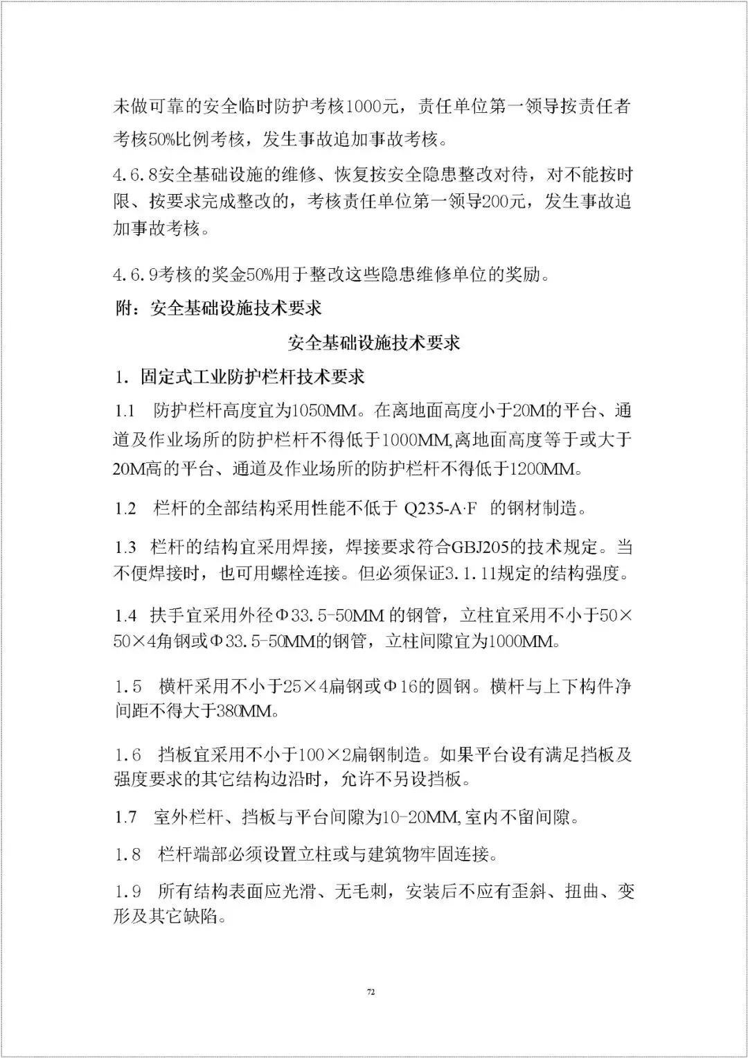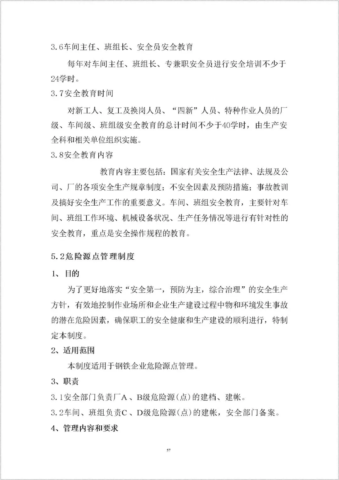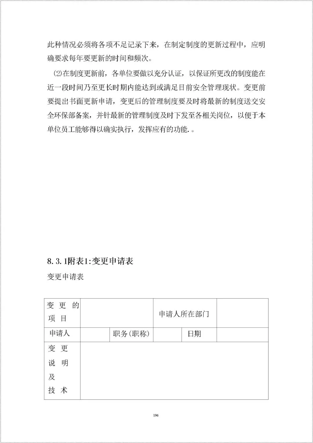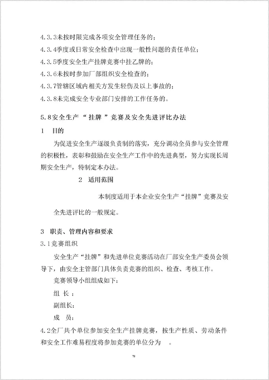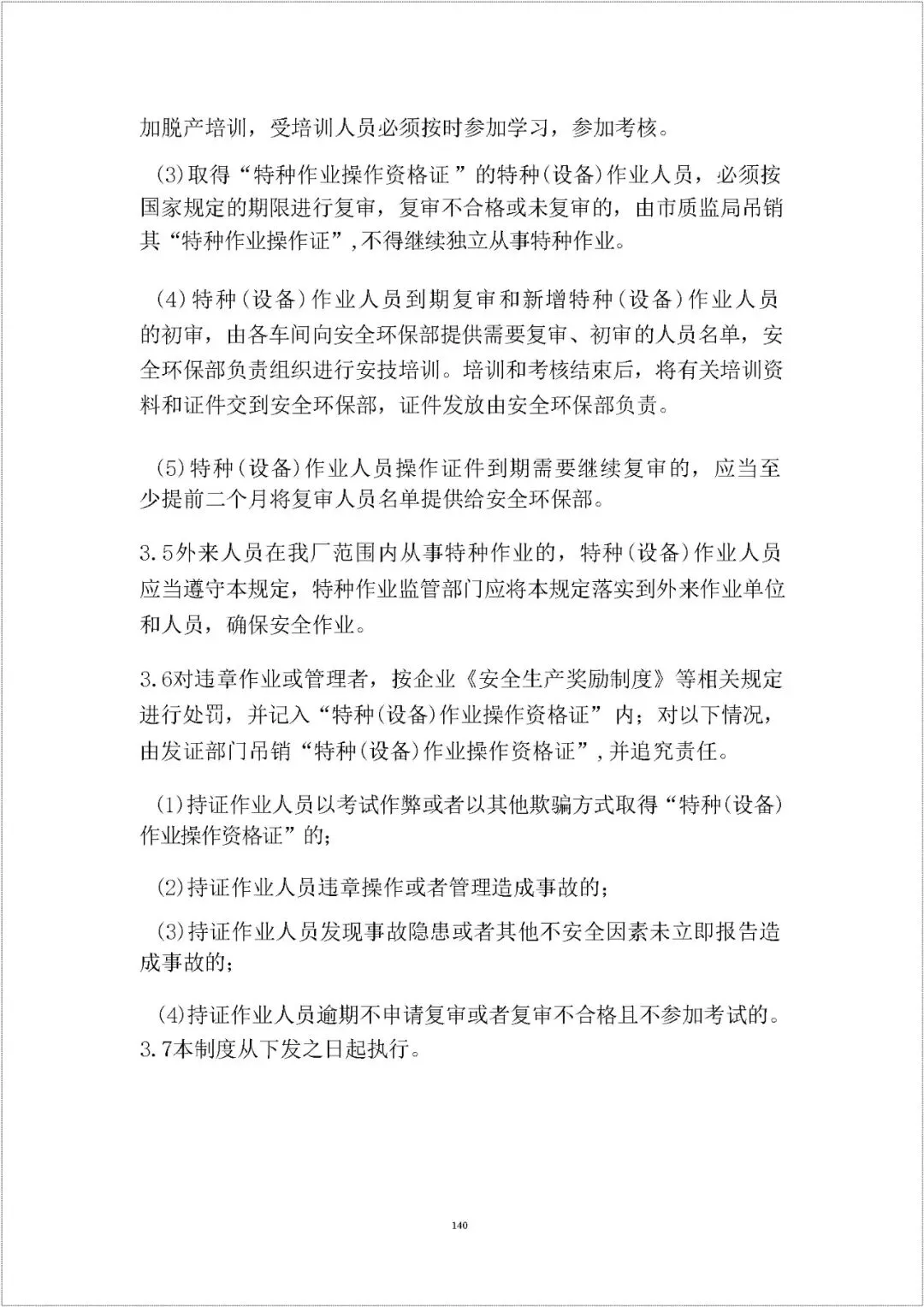 5.2 危险源点管理制度 575.3 煤气安全管理制度 605.4 安全检查制度 675.5 安全基础设施管理制度 705.6 安全奖惩制度 755.7 安全管理奖发放与考核办法 775.8 安全生产“挂牌”竞赛及安全先进评比办法 785.9 消防安全管理制度 795.10 特种作业人员管理制度 825.11 安全投入保障制度 895.12 劳动防护用品(具)和保健品发放管理制度 905.13 事故管理制度 905.14 职业卫生管理制度 925.15 安全生产会议管理制度 93第 6 章 教育培训 956.1 安全教育培训管理制度 956.2 年度安全教育培训计划 996.2.1 附表1:三级教育 1036.2.2 附表2:培训记录 1066.2.3 附表3:人员持证台账 108第 7 章 生产设备设施 1097.1 建设项目安全“三同时”管理制度 1097.2 设备设施安全管理制度 1127.3 生产设备、设施验收管理制度 1177.4 生产设施设备检修、维修和保养的安全管理制度 1197.5 生产设施安全拆除和报废管理制度 1217.6 电气设施安全管理制度 1247.7 特种设备安全管理制度汇编 1307.7.1 附表1:特种设备统计台账 1377.8 特种(设备)作业人员管理制度 138第 8 章 作业安全 1428.1 危险作业管理制度 1428.1.1 交叉作业管理制度 1428.1.2 受限空间作业安全管理制度 1518.1.3 动火作业安全管理制度 1588.1.4 大型吊装作业安全管理制度 1658.1.5 高处作业管理制度 1738.1.6 临时用电安全管理制度 1788.1.7 有毒、有害作业安全管理制度 1838.1.8 能源介质安全作业管理制度 1868.2 警示标志和安全防护管理制度 1918.3 变更管理制度 1938.3.1 附表1:变更申请表 1968.3.2 附表2:变更验收表 198