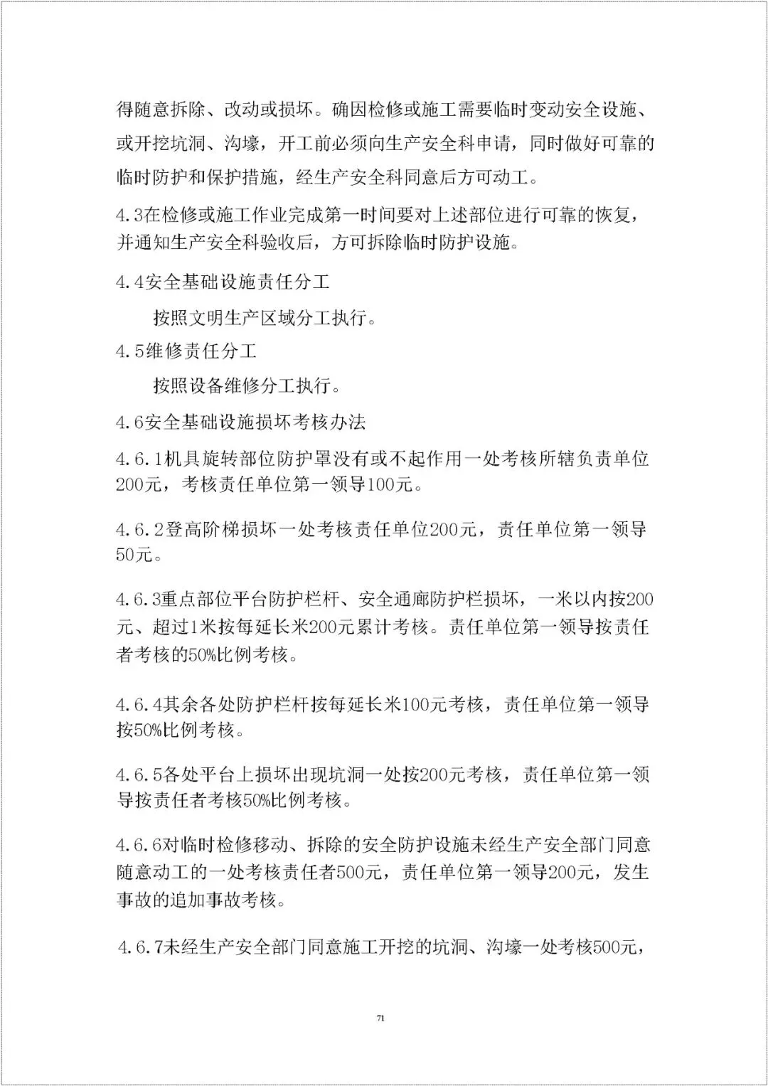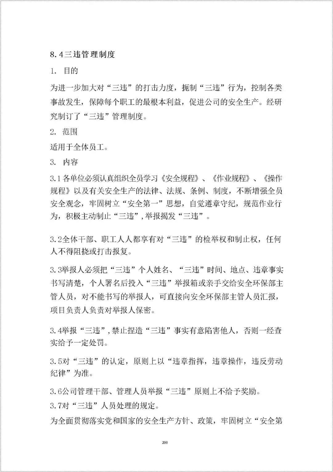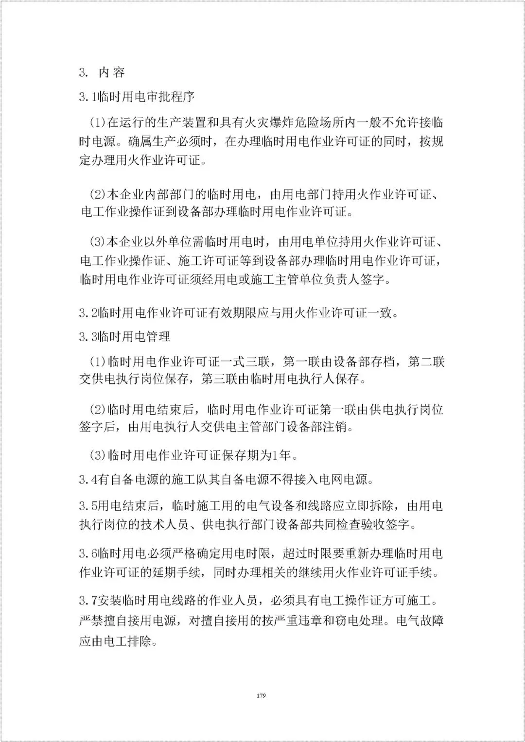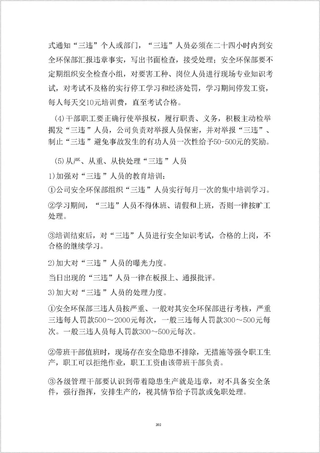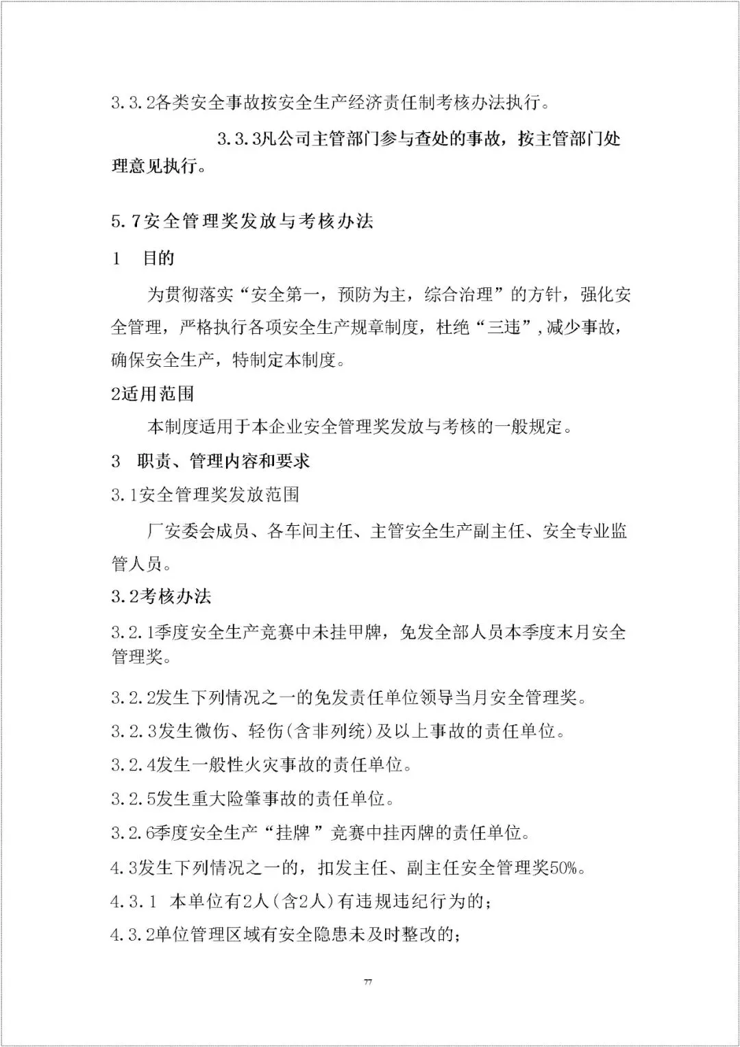 5.2 危险源点管理制度 575.3 煤气安全管理制度 605.4 安全检查制度 675.5 安全基础设施管理制度 705.6 安全奖惩制度 755.7 安全管理奖发放与考核办法 775.8 安全生产“挂牌”竞赛及安全先进评比办法 785.9 消防安全管理制度 795.10 特种作业人员管理制度 825.11 安全投入保障制度 895.12 劳动防护用品(具)和保健品发放管理制度 905.13 事故管理制度 905.14 职业卫生管理制度 925.15 安全生产会议管理制度 93第 6 章 教育培训 956.1 安全教育培训管理制度 956.2 年度安全教育培训计划 996.2.1 附表1:三级教育 1036.2.2 附表2:培训记录 1066.2.3 附表3:人员持证台账 108第 7 章 生产设备设施 1097.1 建设项目安全“三同时”管理制度 1097.2 设备设施安全管理制度 1127.3 生产设备、设施验收管理制度 1177.4 生产设施设备检修、维修和保养的安全管理制度 1197.5 生产设施安全拆除和报废管理制度 1217.6 电气设施安全管理制度 1247.7 特种设备安全管理制度汇编 1307.7.1 附表1:特种设备统计台账 1377.8 特种(设备)作业人员管理制度 138第 8 章 作业安全 1428.1 危险作业管理制度 1428.1.1 交叉作业管理制度 1428.1.2 受限空间作业安全管理制度 1518.1.3 动火作业安全管理制度 1588.1.4 大型吊装作业安全管理制度 1658.1.5 高处作业管理制度 1738.1.6 临时用电安全管理制度 1788.1.7 有毒、有害作业安全管理制度 1838.1.8 能源介质安全作业管理制度 1868.2 警示标志和安全防护管理制度 1918.3 变更管理制度 1938.3.1 附表1:变更申请表 1968.3.2 附表2:变更验收表 198
